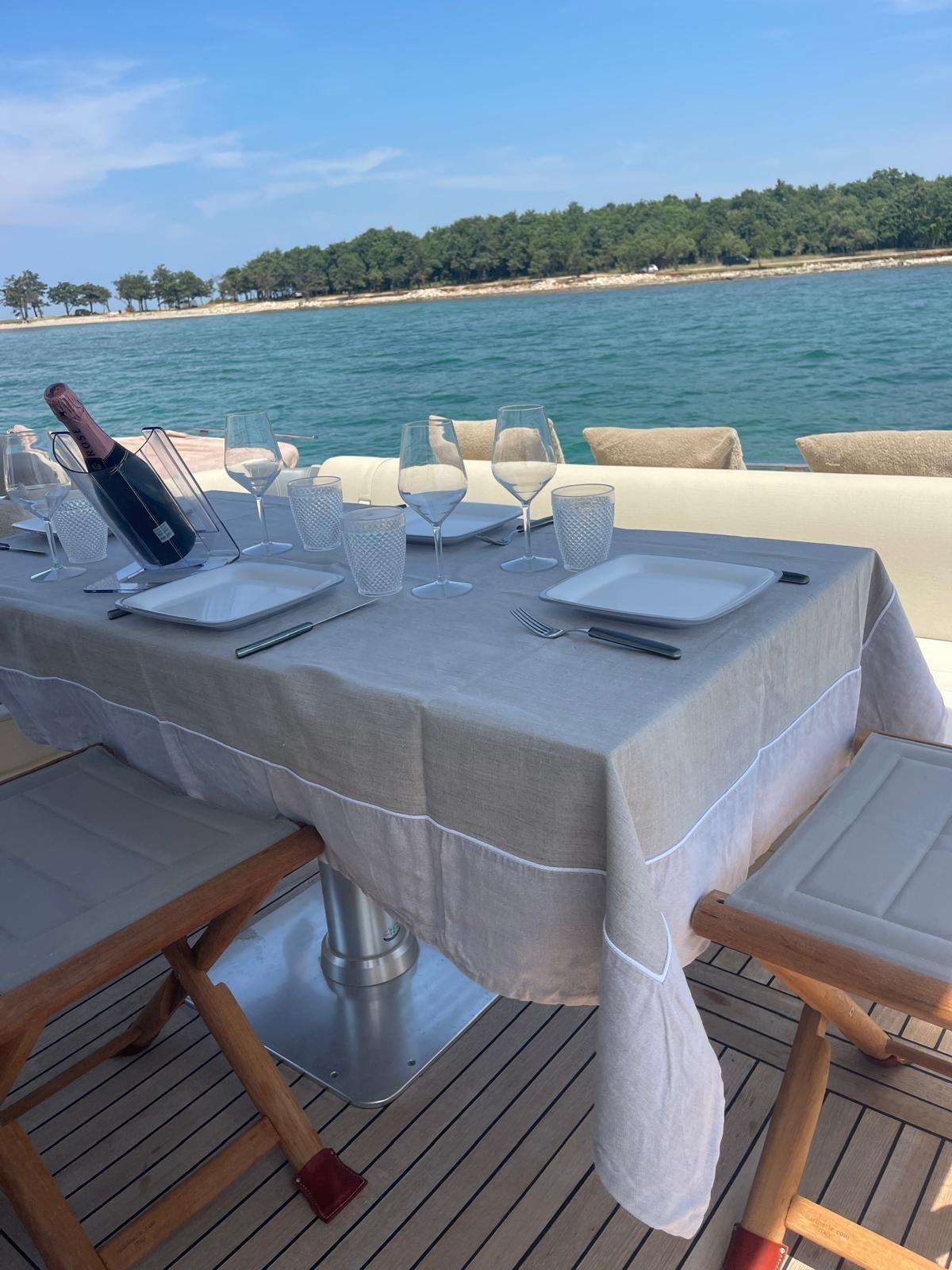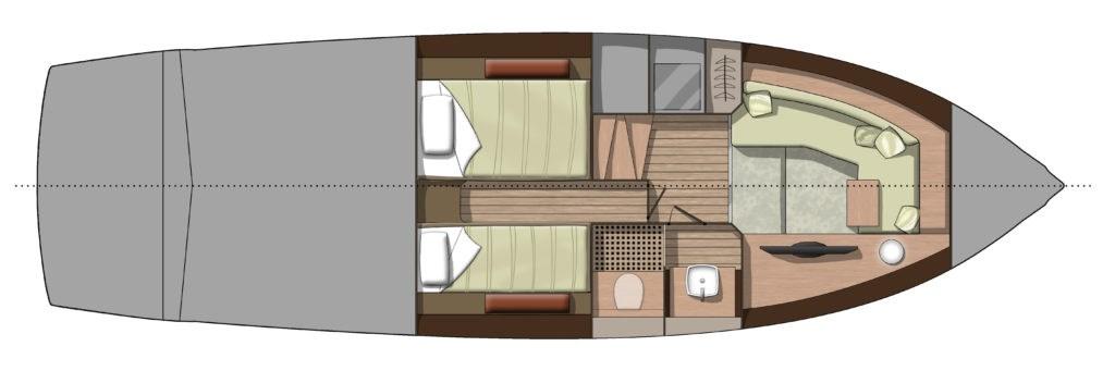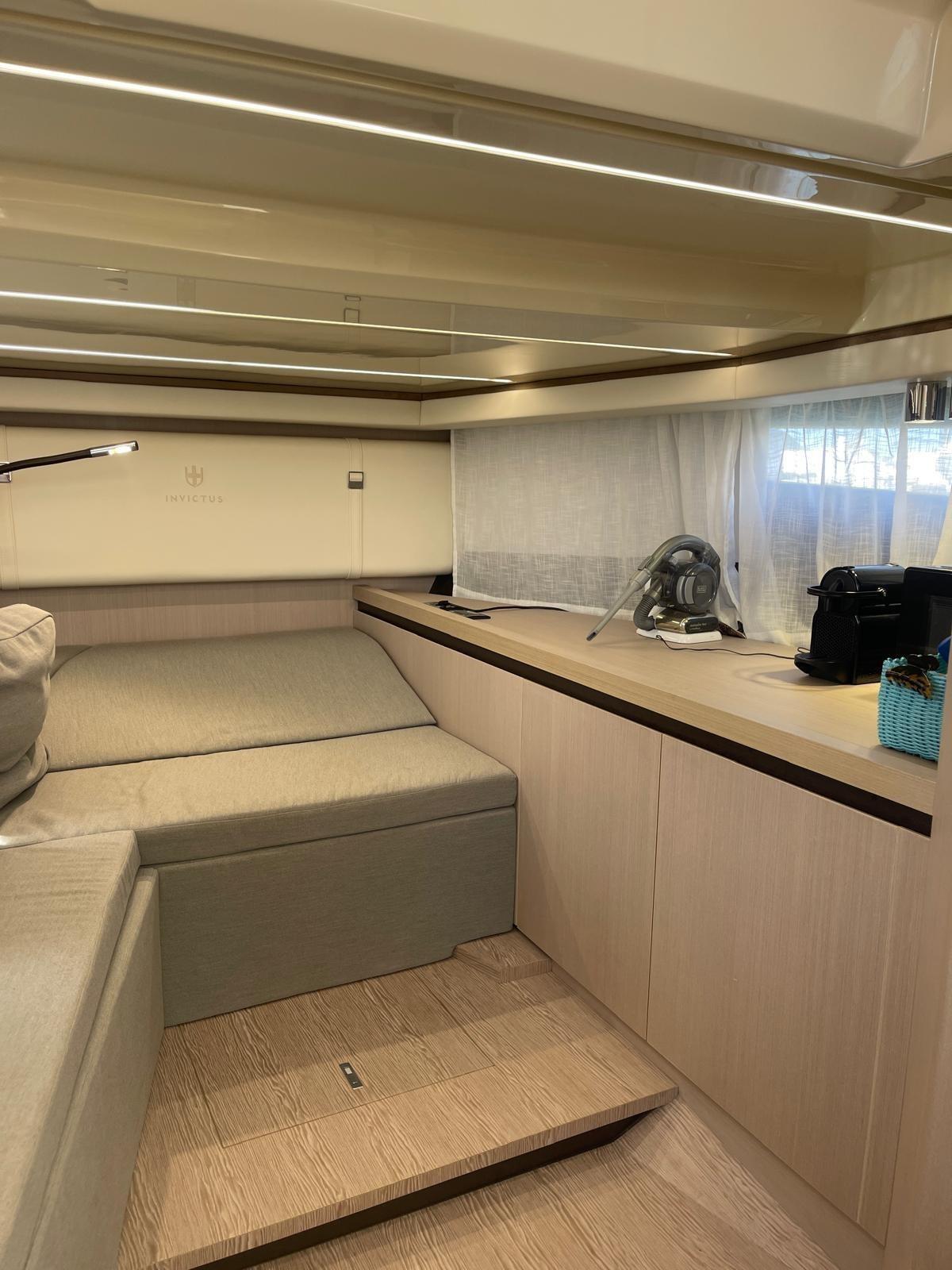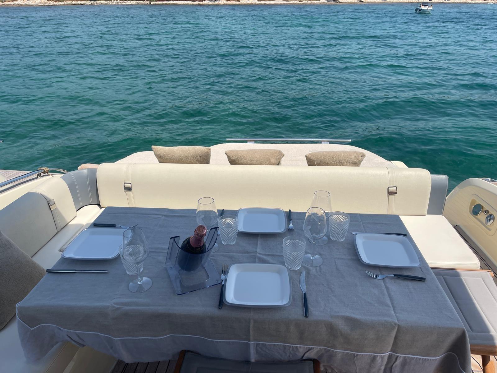 Alarme moteur, Alarme de pompe de cale, Alternateur, Eau sous pression, Câble d’alimentation à quai, Couleur spéciale (SPECTRUM BLUE), Douche de cockpit, Flaps électriques, Extincteur(s) fixe(s), Lavabo dans le cockpit, Éclairage de courtoisie, Spots sous-marins, Passerelle, Plateforme arrière, Pompe de cale automatique, Pompe de cale manuelle, Porte latérale, Cockpit en teck, Prise de quai, Guindeau électrique, Echelle de bain, table de cockpit, Corne, T-Top (CARBONIO).
