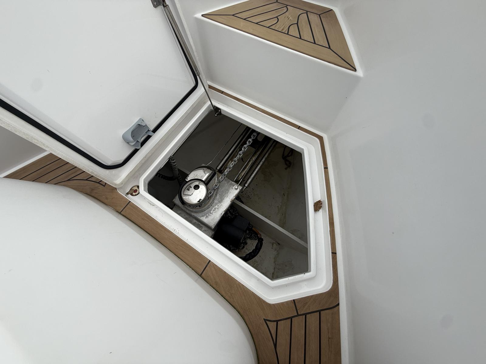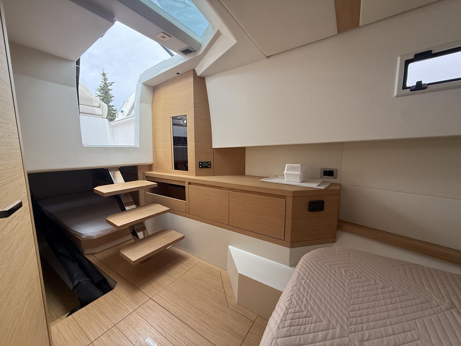 Cabine propriétaire avant, salle d’eau avec WC électrique, T-Top en carbone noir, sellerie Silvertex.