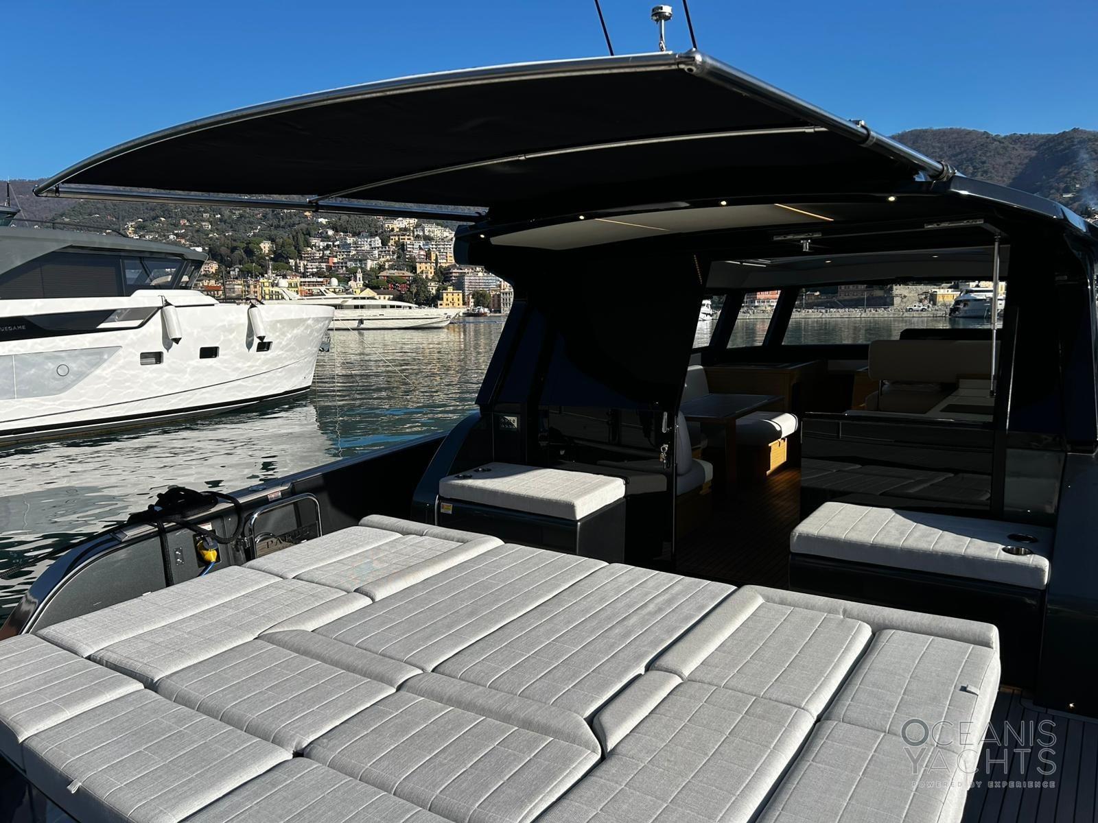 Alarme gaz, Alarme moteur, Alarme de pompe de cale, Alternateur, Auto Dynamic Trim Interceptor, Eau sous pression, Câble d’alimentation à quai, Douche de cockpit, Flaps électriques, Hard top, Éclairage de courtoisie, 8 Défenses, Passerelle (idraulica a scomparsa), Plateforme arrière (idraulica affondabile), Pompe de cale automatique, Pompe de cale manuelle, Pont en teck, Porte latérale, Cockpit en teck, Prise de quai, Guindeau électrique, Echelle de bain, Stabilisateurs (giroscopico), table de cockpit (elettrio), Corne.