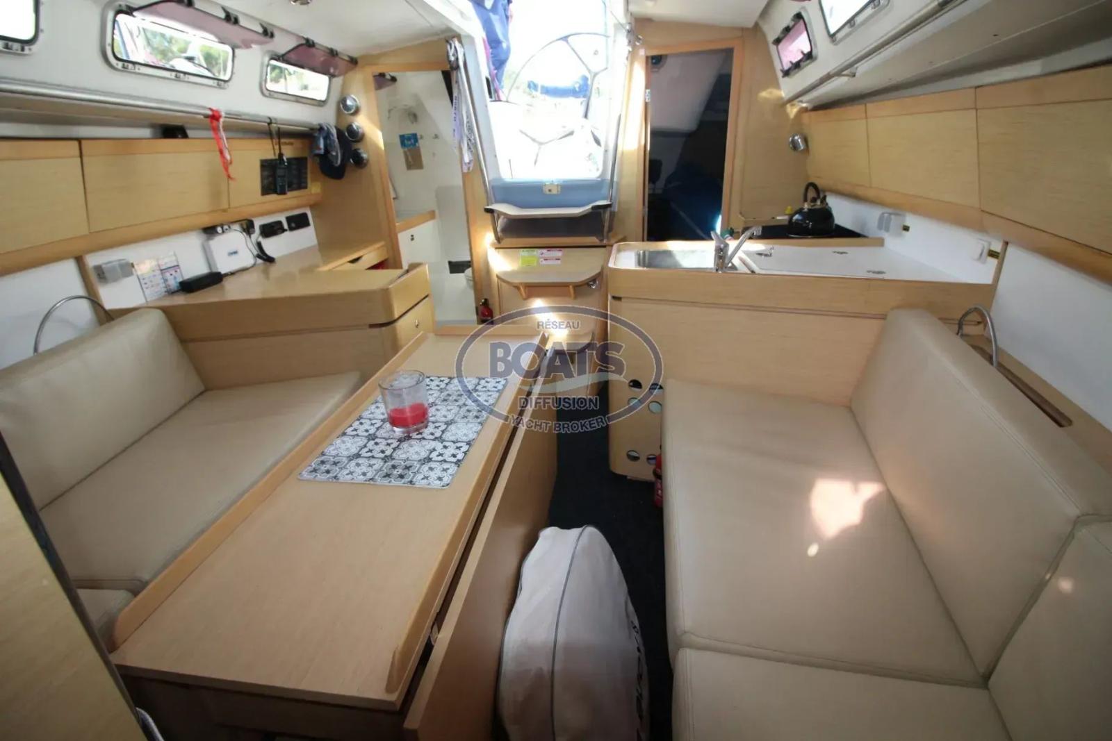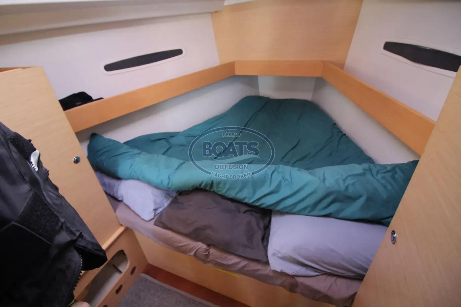 Ce bateau propose également un véritable double programme. En configuration croisière, il dispose d’un jeu de voiles dédié, d’un enrouleur de génois Facnor Flat Deck, d’une capote, d’un bimini, ainsi que d’un Flexiteek récent habillant élégamment le cockpit. Un First 35 clé en main, capable d’aligner les bouées le week-end et de partir en croisière sportive dès le lendemain.