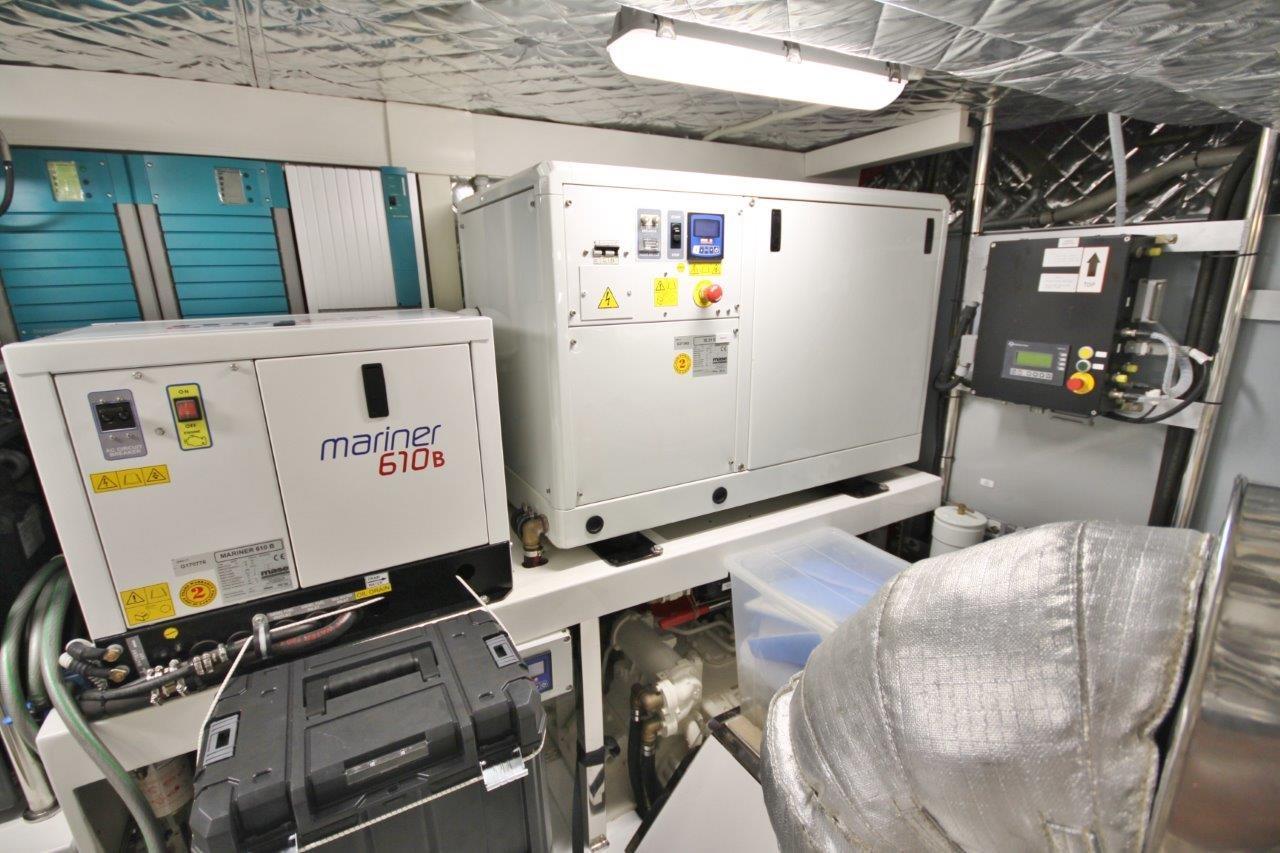 Alarme moteur, Alarme de pompe de cale, 2 Eau sous pression, 8 Batteries, Passavant en teck, Douche de cockpit, Double barre à roue, Phare de poursuite, Flaps hydrauliques, Bossoirs pour annexe, Extincteur(s) fixe(s), Indicateurs de flaps, Lavage de chaine, Spots sous-marins, Passerelle (a scomparsa nuova 2019), Plateforme arrière, 4 Pompe de cale automatique, Porte latérale (elettrica), Porte latérale, Cockpit en teck, Prise de quai, Connexion eau sous pression à quai, Onduleur, Répétiteur électronique, Rollbar, Guindeau électrique, Echelle de bain (idraulica), table de cockpit, Corne, 2 Winch électrique arrière.