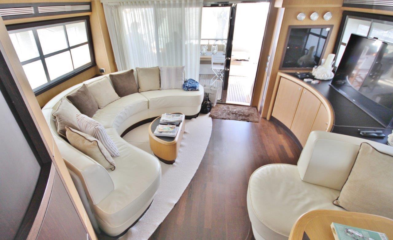 Le cockpit offre un canapé linéaire confortable avec table, un équipement d’amarrage entièrement rétractable et une échelle solide et confortable menant au pont volant, sur lequel se trouve une grande dinette, une armoire multifonctionnelle avec évier, gril et réfrigérateur, un grand solarium à l’avant du contre-pont de direction, ainsi qu’un espace à l’arrière pour l’annexe et le bossoir. Les intérieurs offrent une habitabilité attentive à l’intimité individuelle, tandis que l’attention portée aux détails et aux finitions rend les espaces communs élégants et sophistiqués.