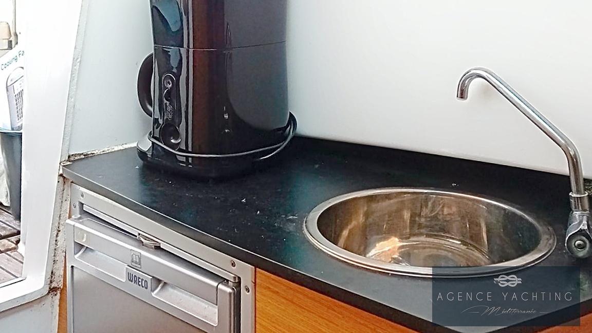 Côté équipements, tout est réuni pour naviguer en toute sérénité grâce à un combiné GPS/sondeur, des feux de navigation, un taud de soleil pour les mouillages estivaux et un taud de protection pour préserver durablement le bateau. Le confort à bord est renforcé par un cabinet de toilette indépendant avec WC chimique, un réfrigérateur, rendant les escales et sorties prolongées particulièrement agréables.