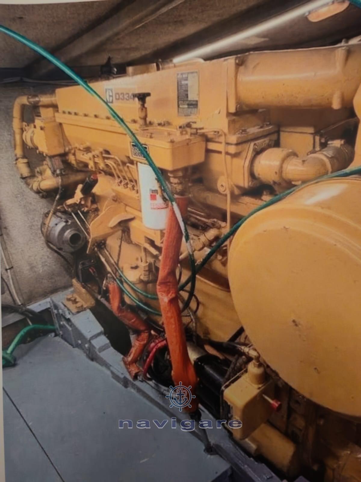 Les moteurs ont été embarqués, après avoir été ramenés à zéro heure par Caterpillar, en octobre 2023, mais le bateau était encore en rénovation totale (dans le hangar, chantier naval supérieur), il a donc été lancé fin 2024. Les locomotives ont 150 h. Le teck date de 2024 : 1,5 cm d’épaisseur ! Le bateau a été repeint avec des produits de grande qualité et à grande coût.