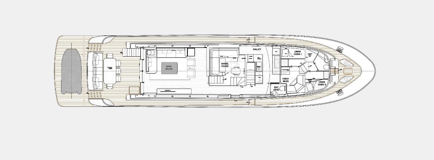 Disposition avec un grand salon principal avec canapés et fauteuils et un grand espace salon dans la timonerie, avec une cuisine à la proue avec des plateaux Corian (également dans les salles de bains). Toilettes de jour.