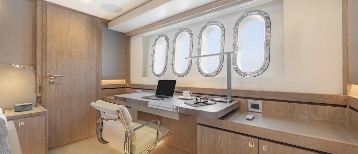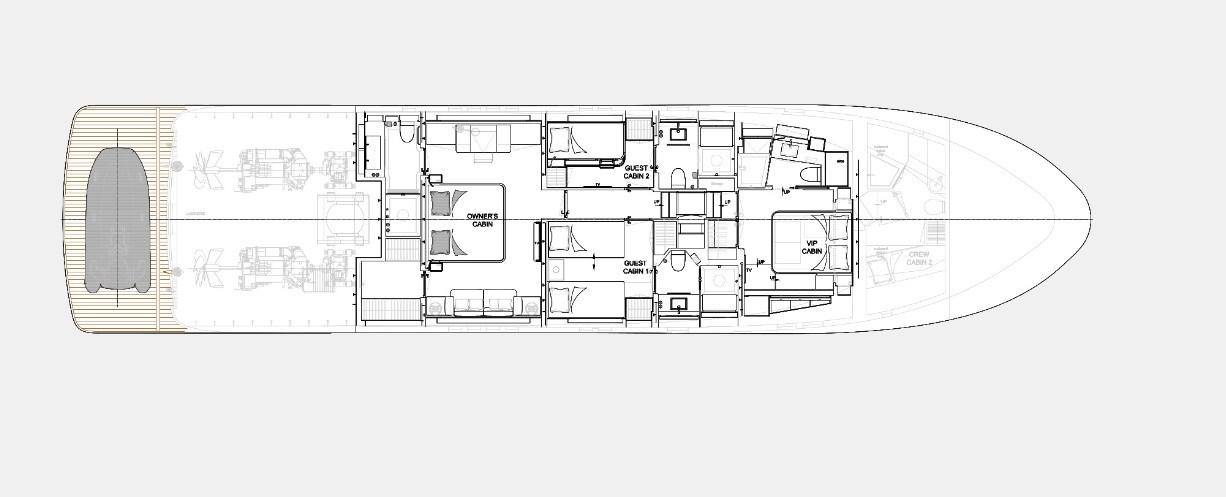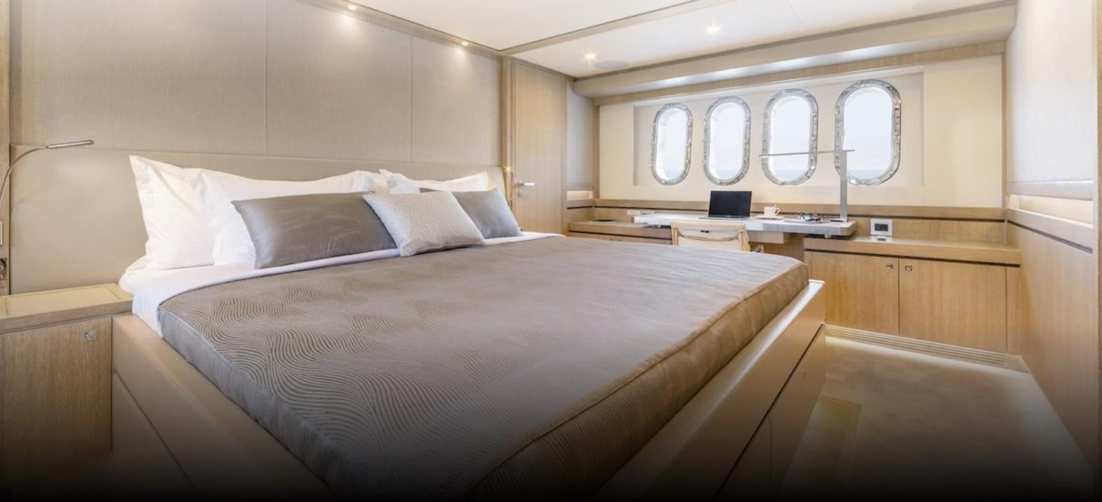 1 chambre principale king size pleine faisceau au centre du navire avec bureau, coin salon et walk-in ; 1 chambre double VIP à la proue ; 1 chambre double (lits coulissants) ; 1 invité par chambre superposée ; salle de bain privée dans chaque cabine (cabines de douche et murs de salle de bain en Corian et céramique, toilettes électriques/bidet Planus).