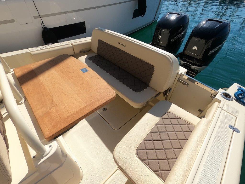 Configuration : coque open console centrale, bain de soleil avant, carré arrière avec table, couchage double et WC dans console.