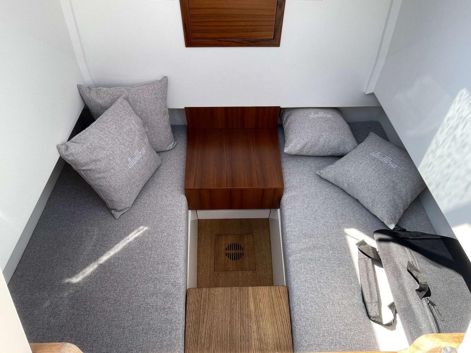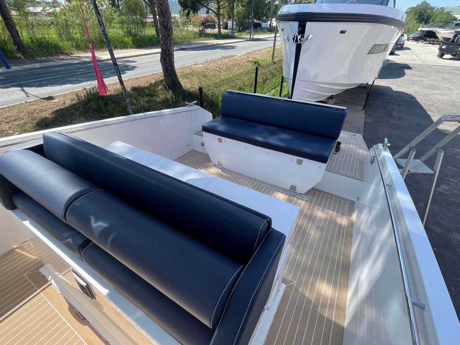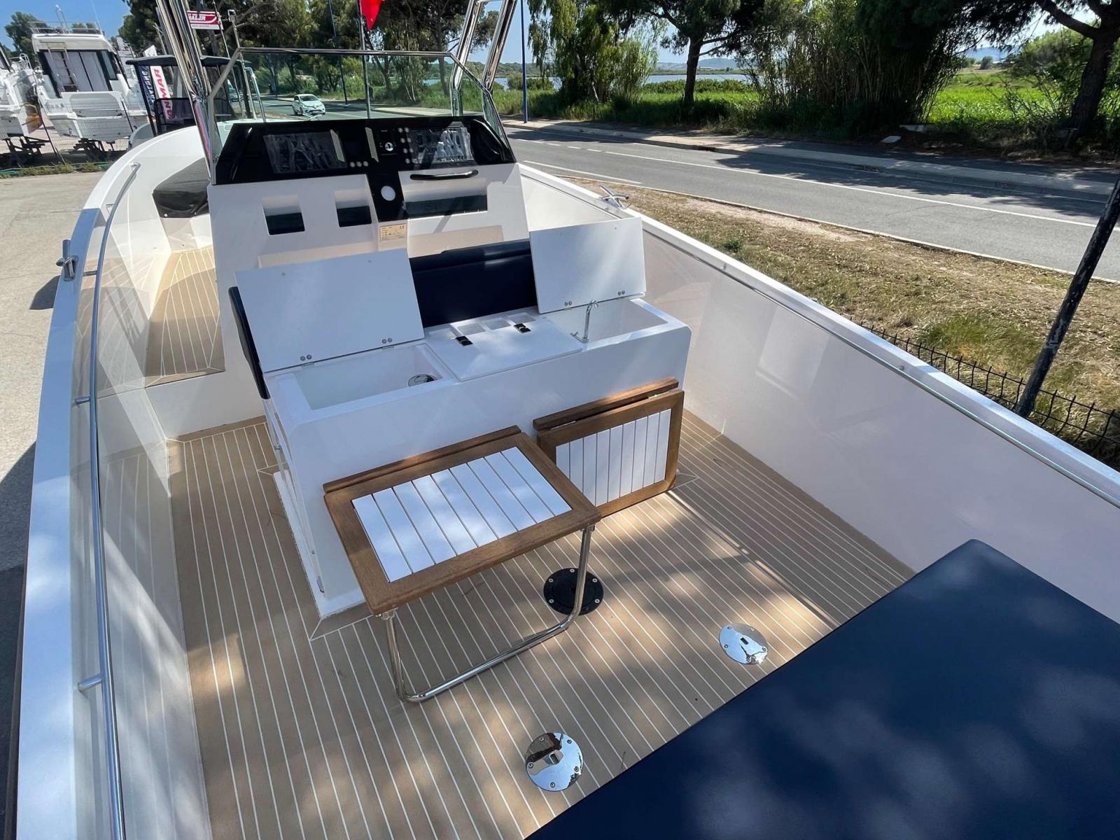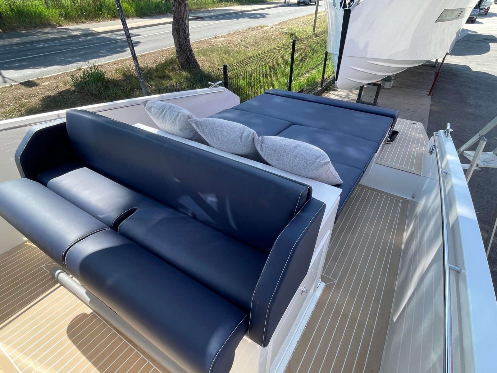 Coque open console centrale avec couchage double, salon avant, carré arrière convertible en grand bain de soleil
