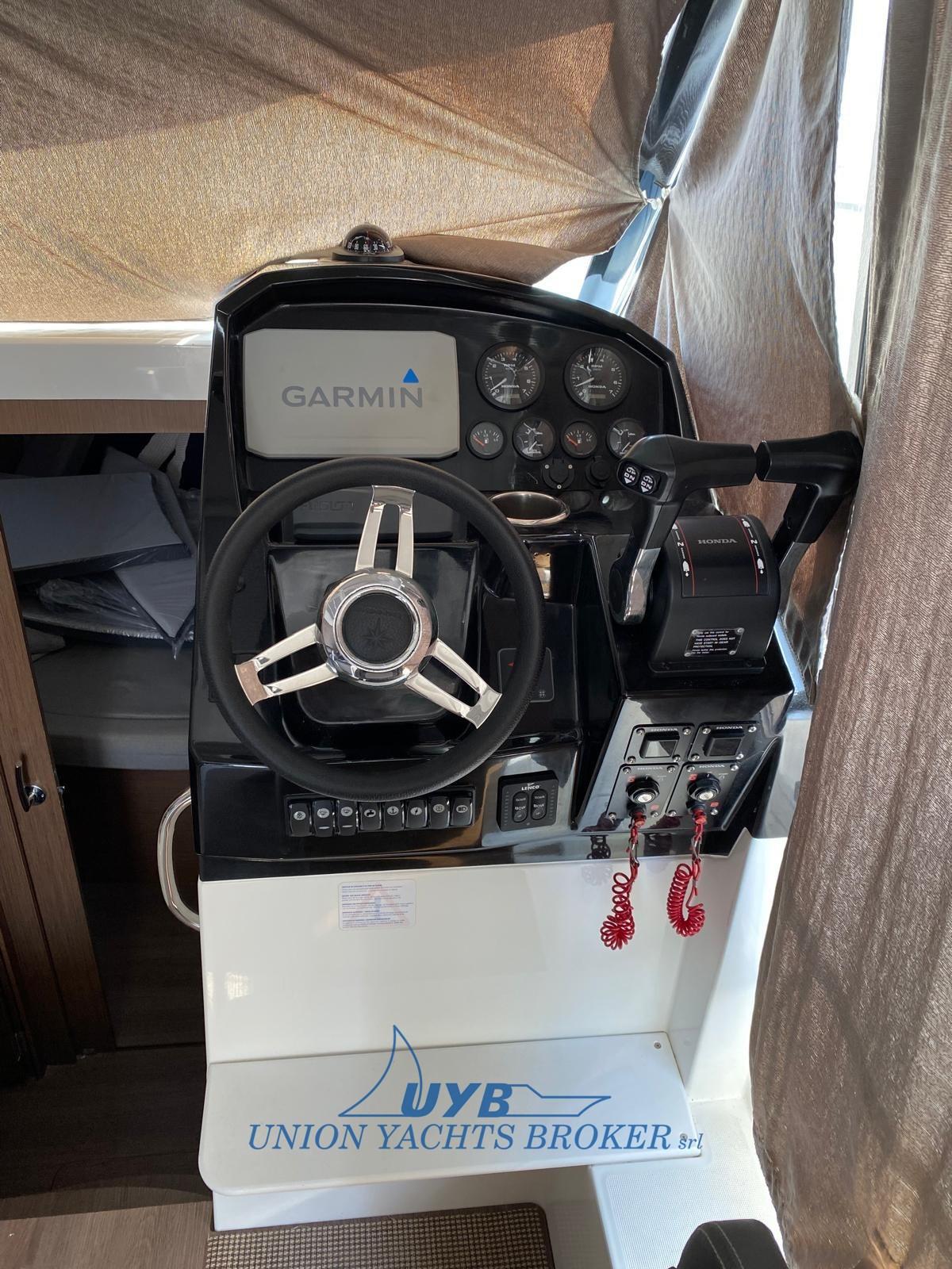 Douche de cockpit, Flaps électriques (Lenco), Hard top (con tettuccio scorrevole e barre porta sup), Passerelle (in teak pieghevole), Plateforme arrière (di prua con scaletta), Pompe de cale manuelle, Porte latérale, Porte latérale, Cockpit en teck, Prise de quai, Guindeau électrique, Echelle de bain.