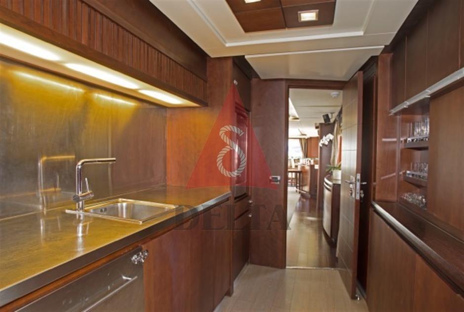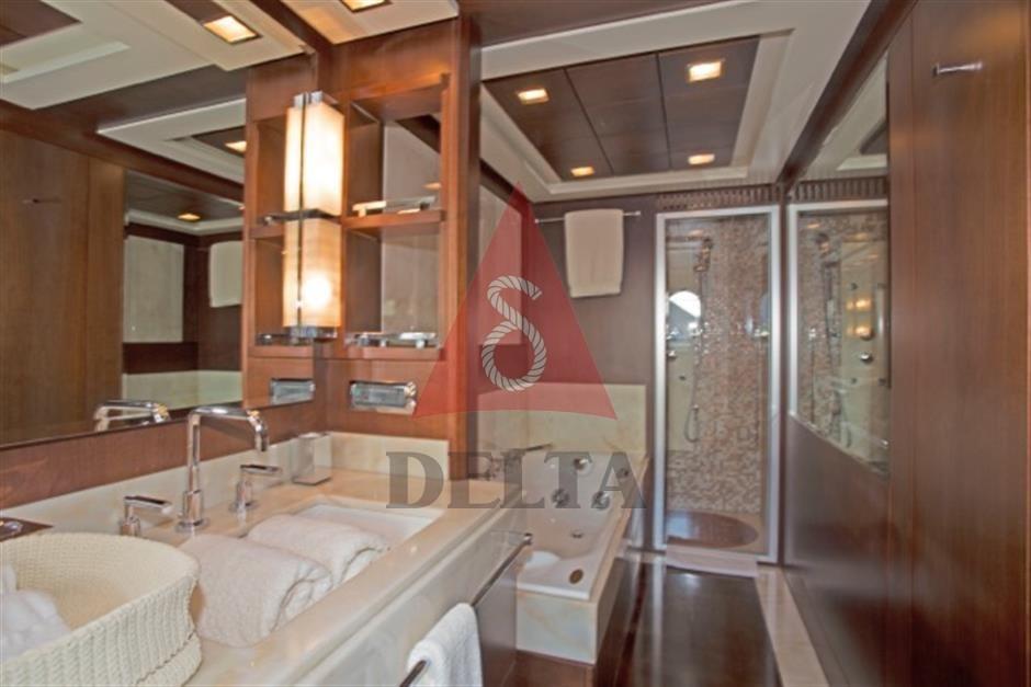 La cabine principale est située amidships sur le pont inférieur. Elle dispose d’un lit king-size, d’une baignoire complète avec douche et