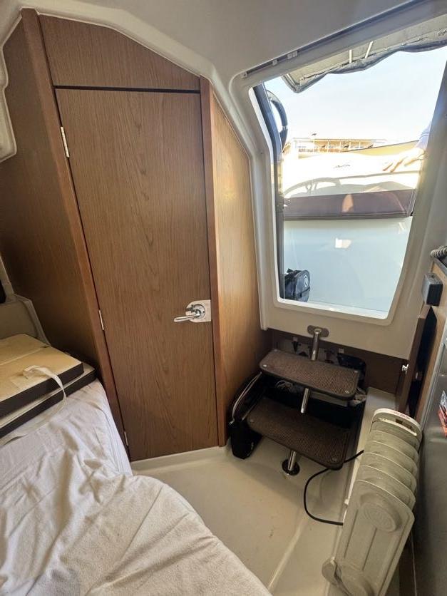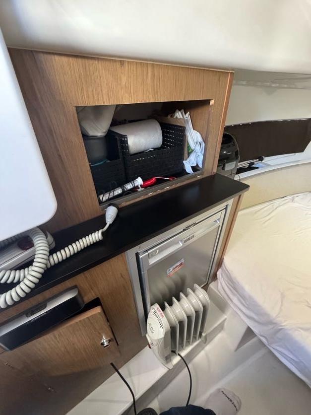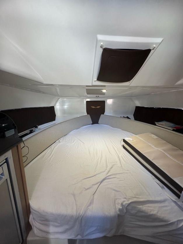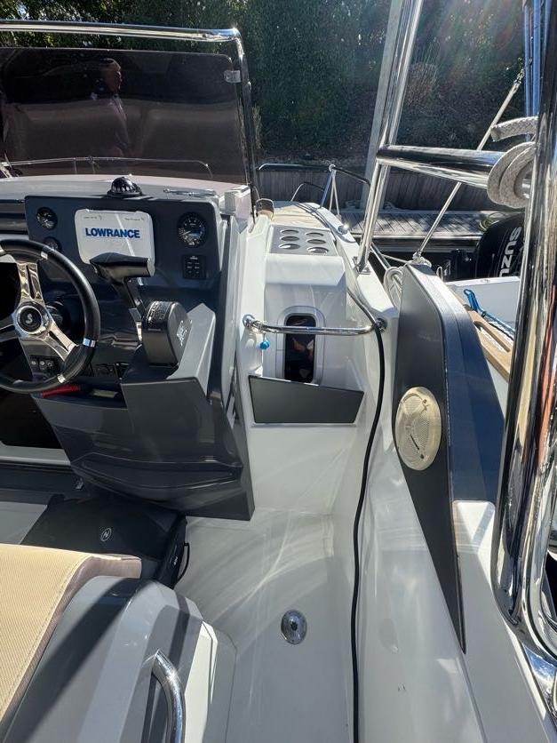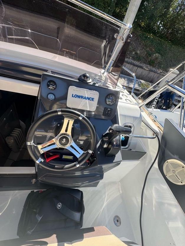 La cabine accueille un couchage double confortable et dispose d’un réfrigérateur de 42 litres, permettant de conserver boissons et rafraîchissements au frais. Le bateau est équipé d’un WC marin avec réservoir d’eaux noires, garantissant plus d’autonomie et de confort à bord. La prise de quai 220V avec chargeur de batterie ainsi qu’une batterie supplémentaire de 110Ah assurent une gestion électrique fiable lors des escales. Enfin, l’équipement électronique avec écran tactile Lowrance facilite la navigation tout en apportant une touche moderne à l’ensemble.