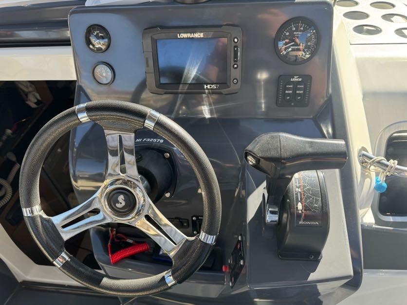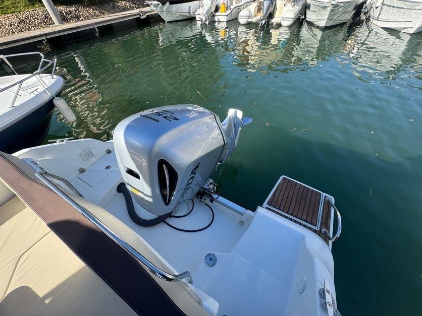 Le Beneteau Flyer 7.7 SUNdeck est équipé d’un moteur hors-bord Honda BF250 de 250 chevaux, une motorisation réputée pour sa fiabilité, sa souplesse et sa sobriété. Ce V6 4 temps offre des accélérations franches et une excellente réserve de puissance, permettant au bateau de déjauger rapidement même en charge et de maintenir une vitesse de croisière confortable et sécurisante. La montée en régime est progressive et linéaire, ce qui rend la navigation agréable aussi bien en balade tranquille qu’en conduite plus dynamique.