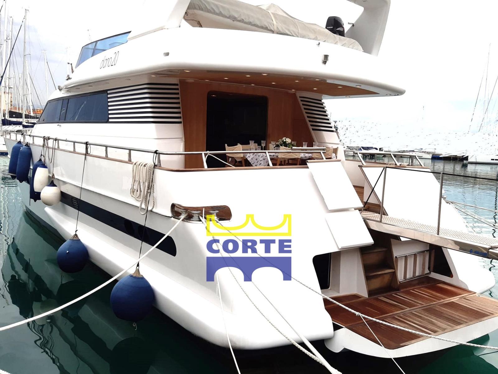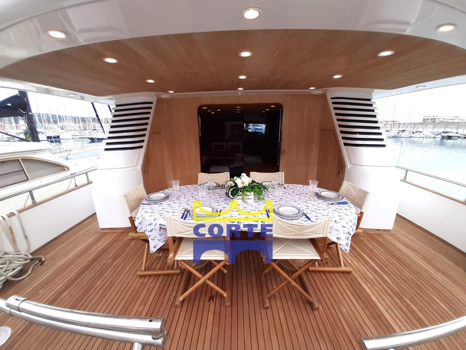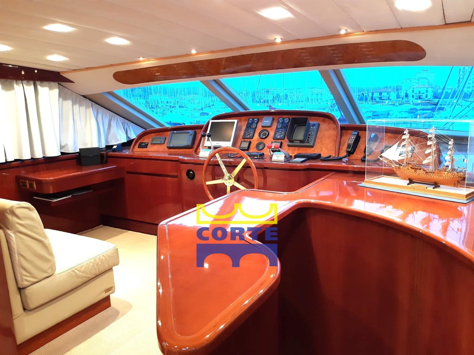 Alarme moteur, Alarme de pompe de cale, Eau sous pression (doppia), Batteries (motori 2021), Passavant en teck, Douche de cockpit, Double barre à roue, Flaps hydrauliques, Grue de flybridge, Extincteur(s) fixe(s), Éclairage de courtoisie, Passerelle (idraulica), Plateforme arrière (poppa a movimentazione up down), Pompe de cale automatique, Porte latérale, 2 Porte latérale, Cockpit en teck, Prise de quai, Connexion eau sous pression à quai, Répétiteur électronique, Rollbar, Guindeau électrique, Echelle de bain, table de cockpit, Corne, 2 Winch électrique arrière.