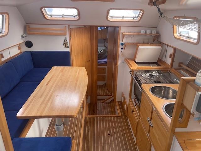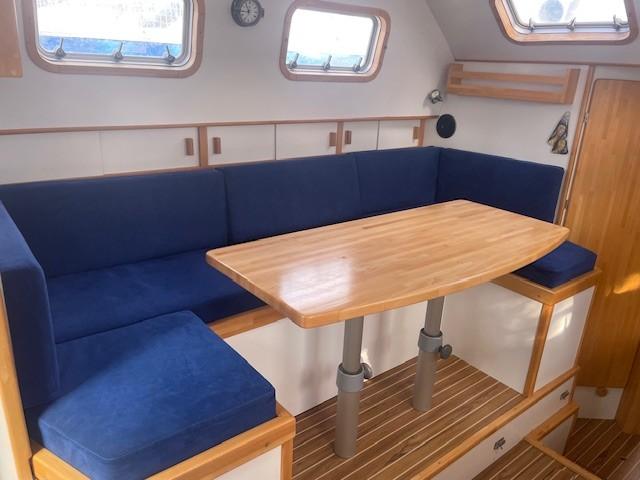 Carré surélevé et décalé offre une belle vue sur Mer par les hublots de coque, il est aussi convertible en couchage d’appoint. HSB sur avant du carré est de 1.94m, la table du carré fait 122x55cm, elle est convertible en grand lit double 2.20×1.00m(6 panneaux de pont,3 hublots de rouf et 3.10m de linéaire de banquette.