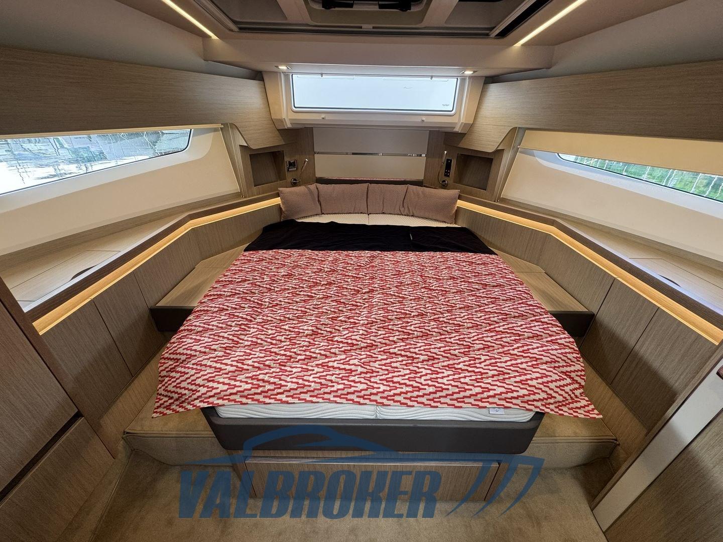 Flybridge du chantier naval allemand, propulsé par 2 moteurs turbo diesel Common Rail 2x Volvo D6 IPS600 et avec seulement 295 heures de moteur. L’entretien était effectué régulièrement par le centre officiel de service Volvo Penta. Intérieur en bois clair. Sous le pont, il y a trois cabines plates : deux cabines doubles et une cabine d’amis avec deux lits séparés et deux salles de bains. Cuisine avec four, plaque à induction, lave-vaisselle et deux grands réfrigérateurs. Générateur, propulseur d’étrave, joystick de manœuvre Volvo Penta, climatisation réversible.