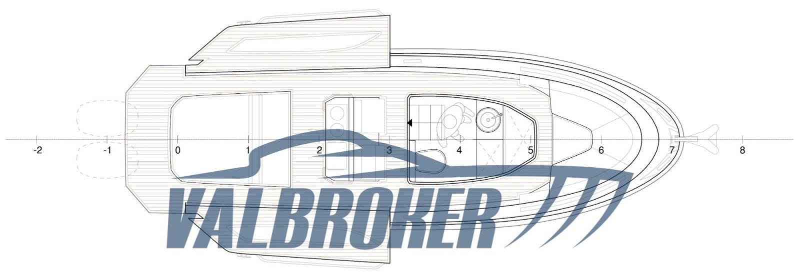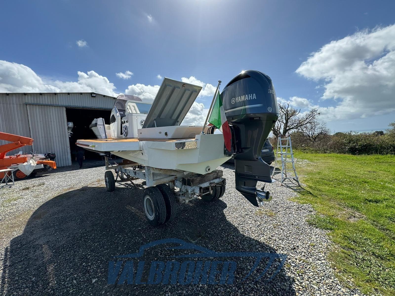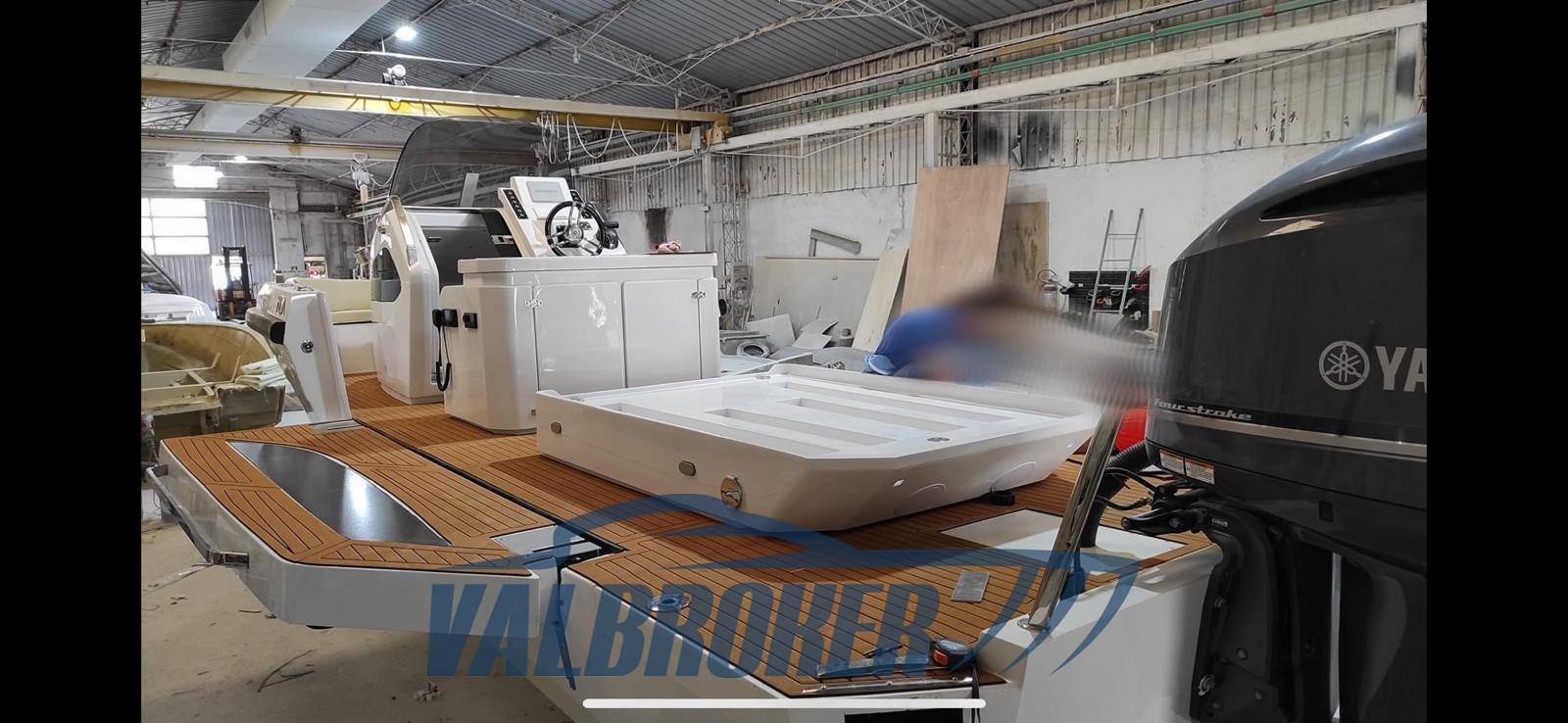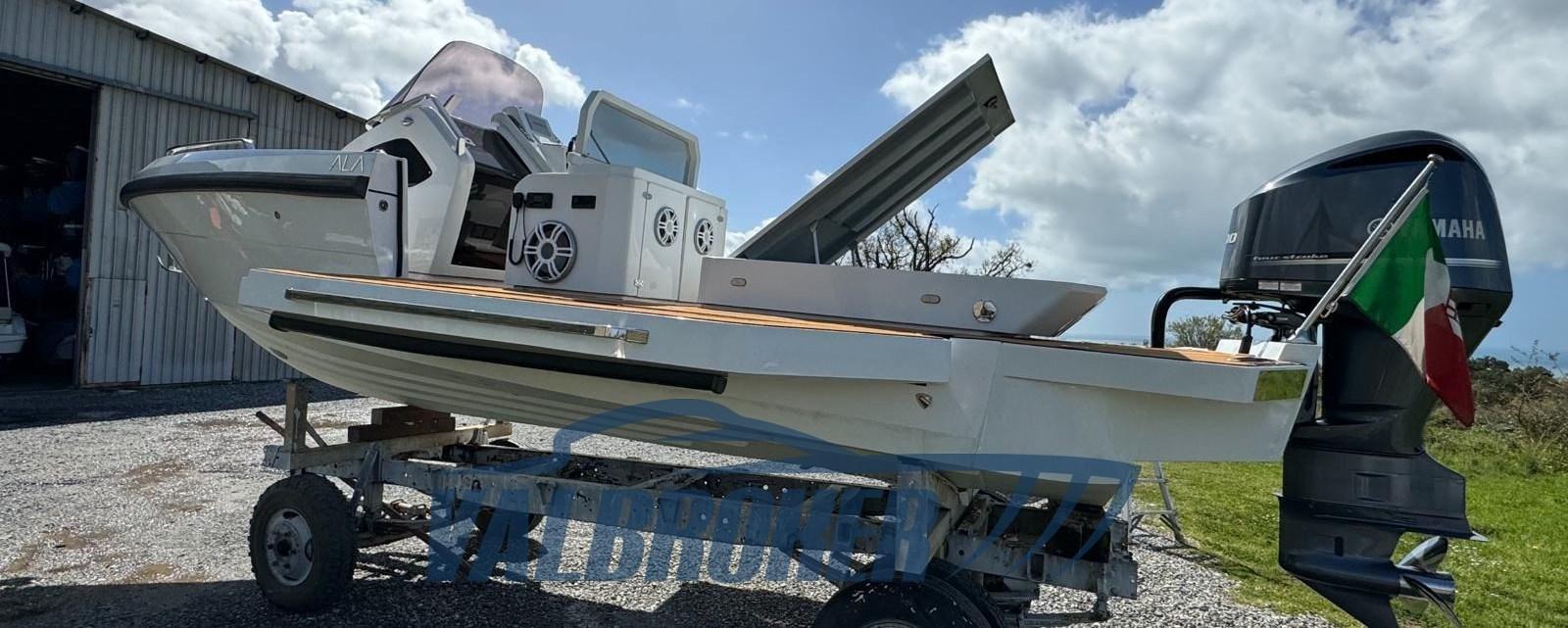 Walkaround produit par le chantier naval italien ALA Yachts. Équipée de rampes latérales arrière qui s’ouvrent électrohydrauliquement, augmentant la largeur de 2,47 mètres à 3,45 mètres, créant une terrasse surplombant la mer. Des passages sûrs autour de la console centrale, facilitant la circulation entre la proue et la poupe.