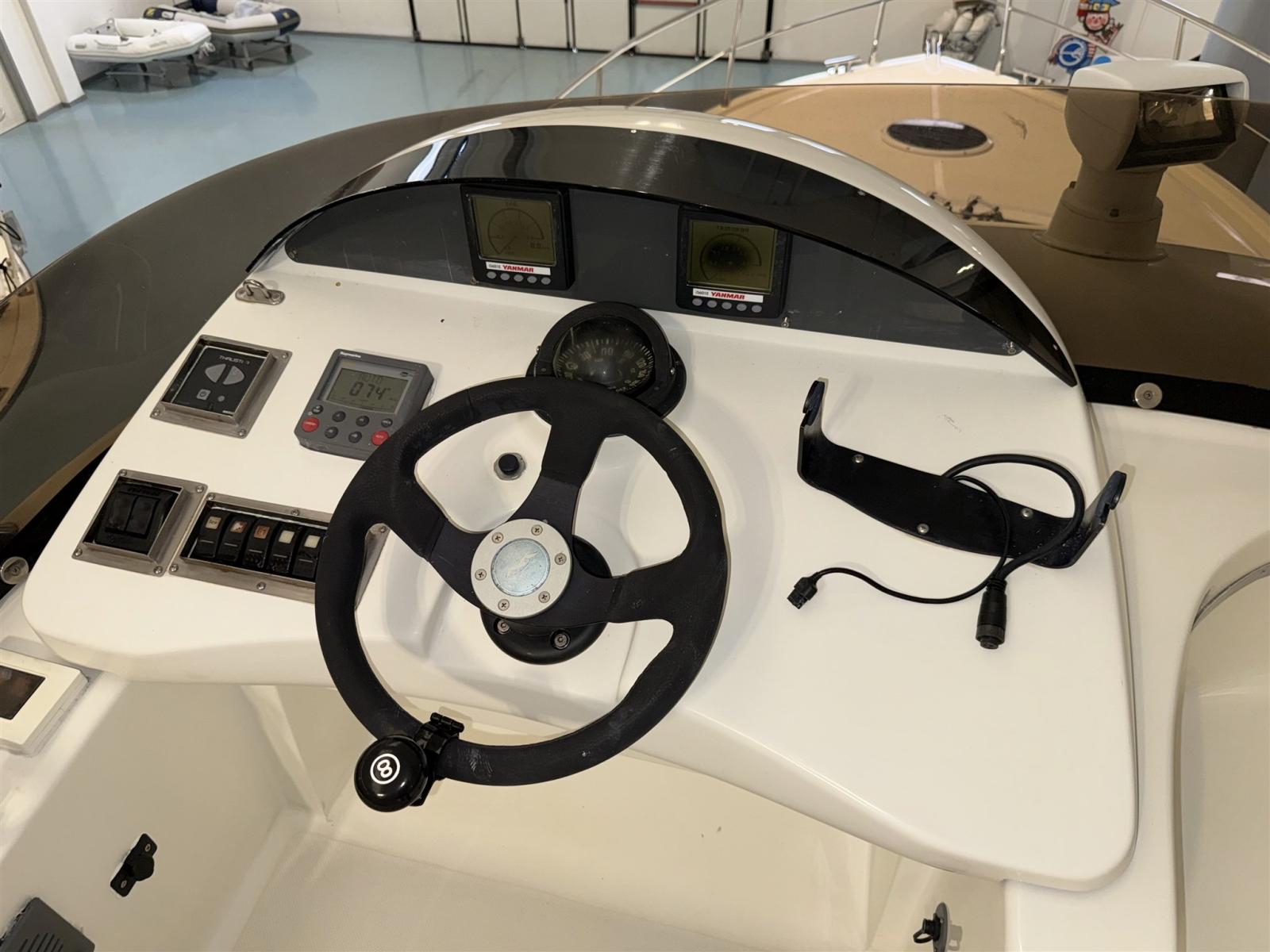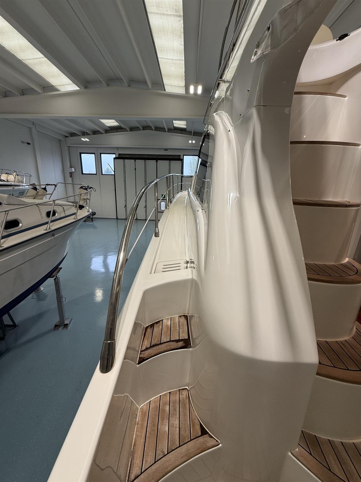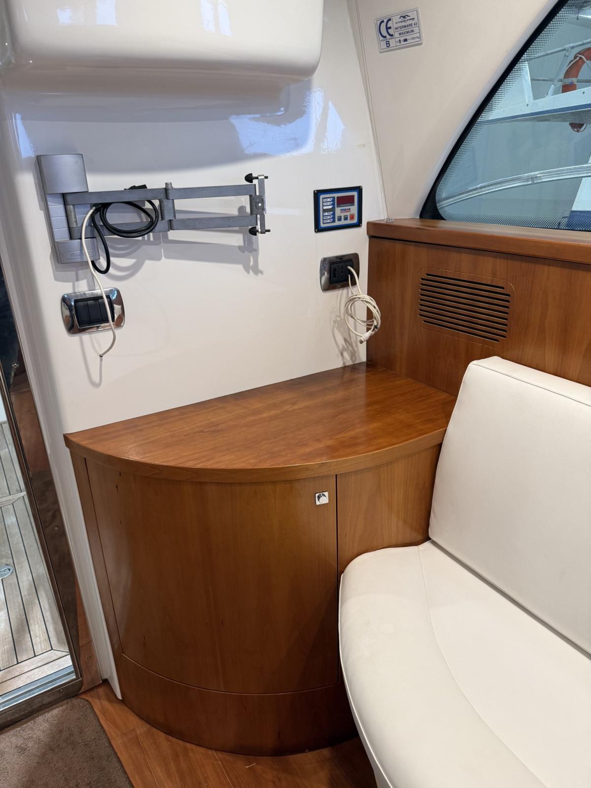 Alarme gaz, Alarme moteur, Eau sous pression, Câble d’alimentation à quai, Douche de cockpit, 2 Flaps hydrauliques, Passerelle (IDRAULICA), Plateforme arrière, Pompe de cale automatique, Cockpit en teck, Prise de quai, Rollbar, Guindeau électrique, Echelle de bain, Corne.