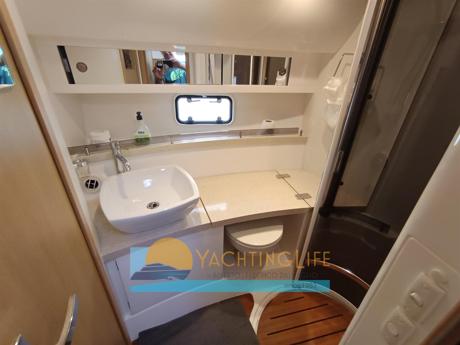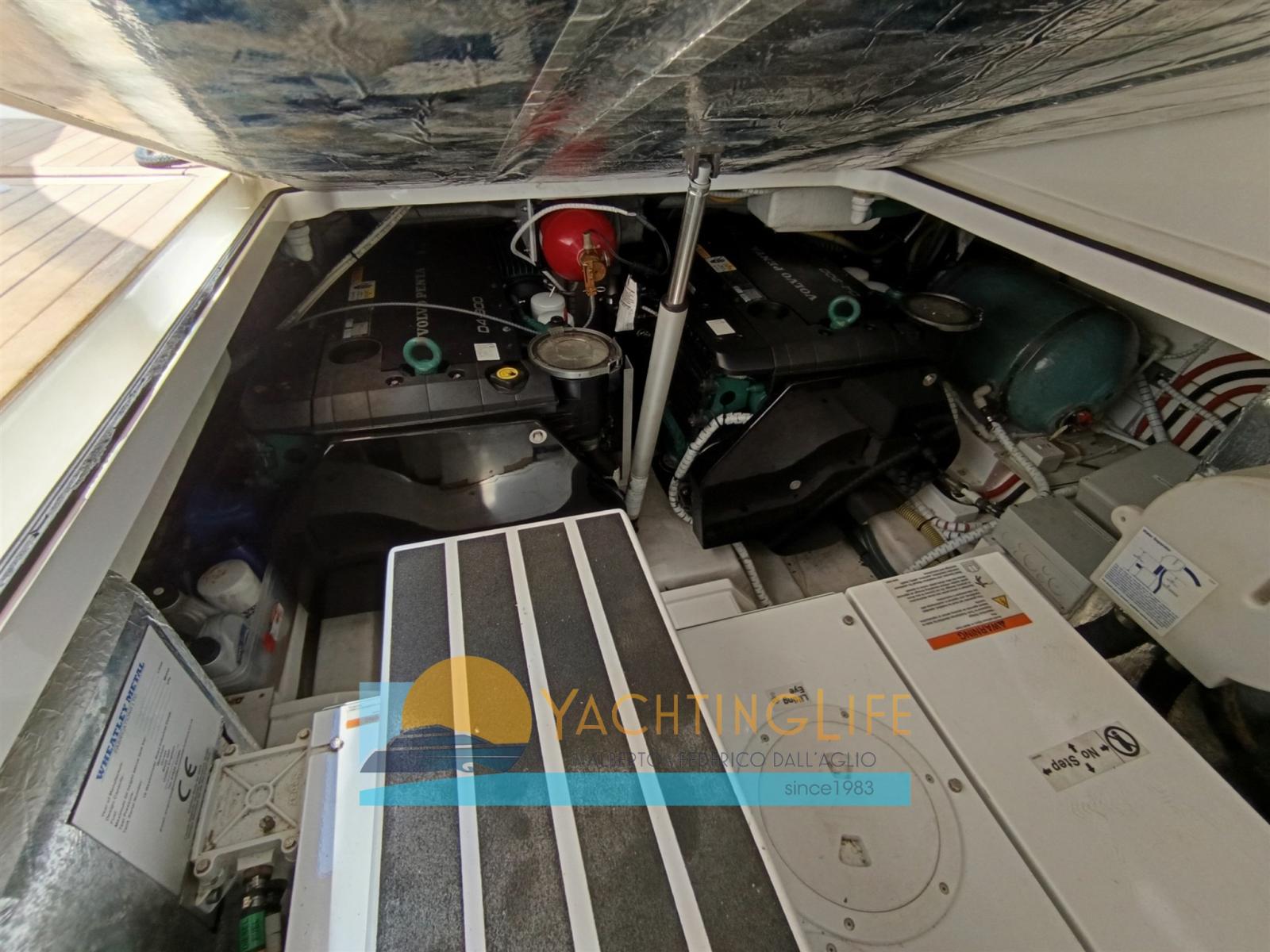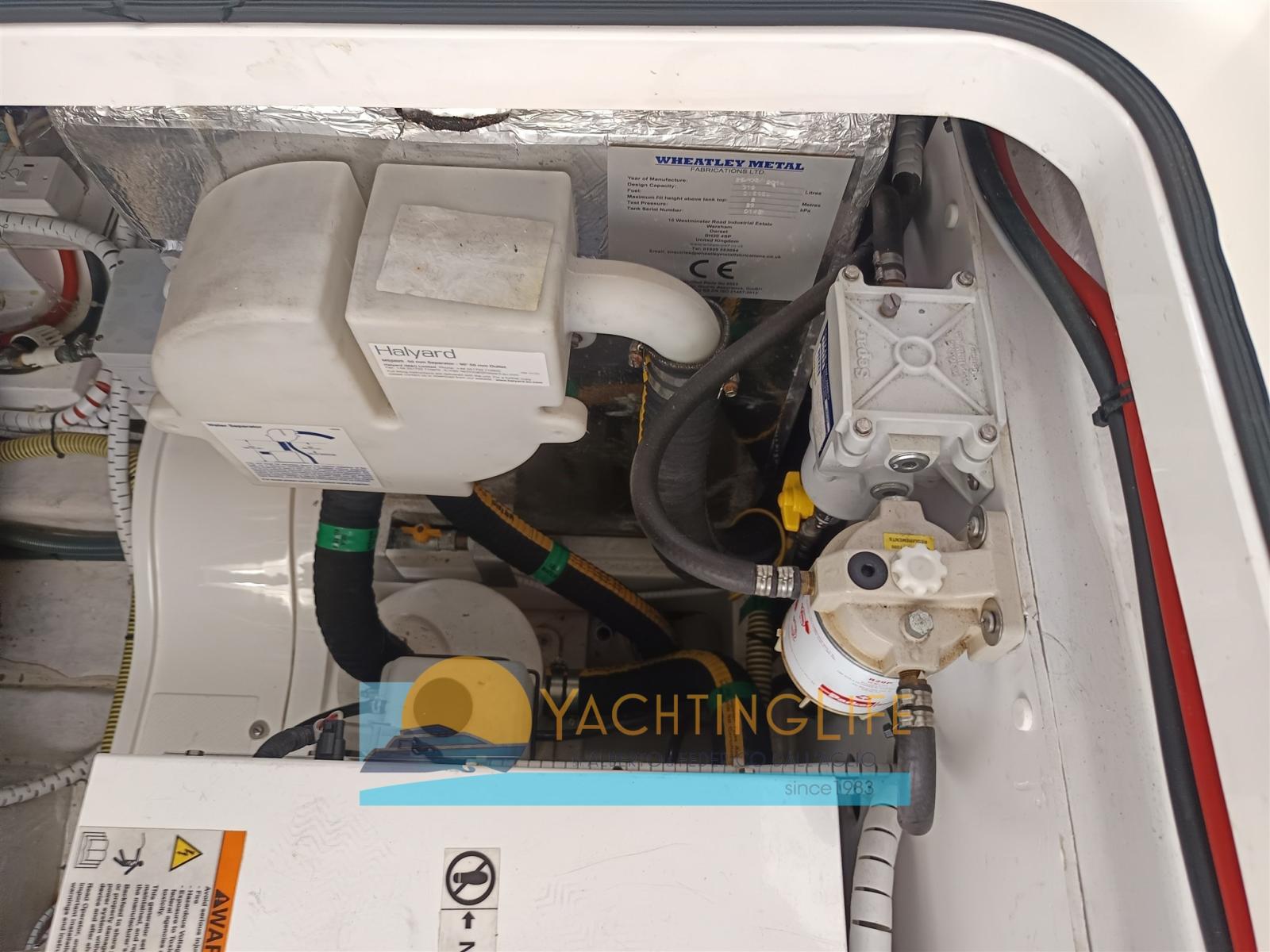 Alarme moteur, Ouverture du compartiment moteur électrique, Eau sous pression, Radeau de sauvetage (8p), 6 Batteries, Douche de cockpit, Flaps électriques, Hard top, Lavabo dans le cockpit, Éclairage de courtoisie, Spots sous-marins, Moteur d'annexe (Yamaha 8hp), Passerelle (Idraulica), Plateforme arrière (Tenderlift), Pompe de cale automatique, Porte latérale, Prise de quai, Onduleur, Guindeau électrique, Echelle de bain, Annexe (Arimar 250 e motore 8hp), Corne.
