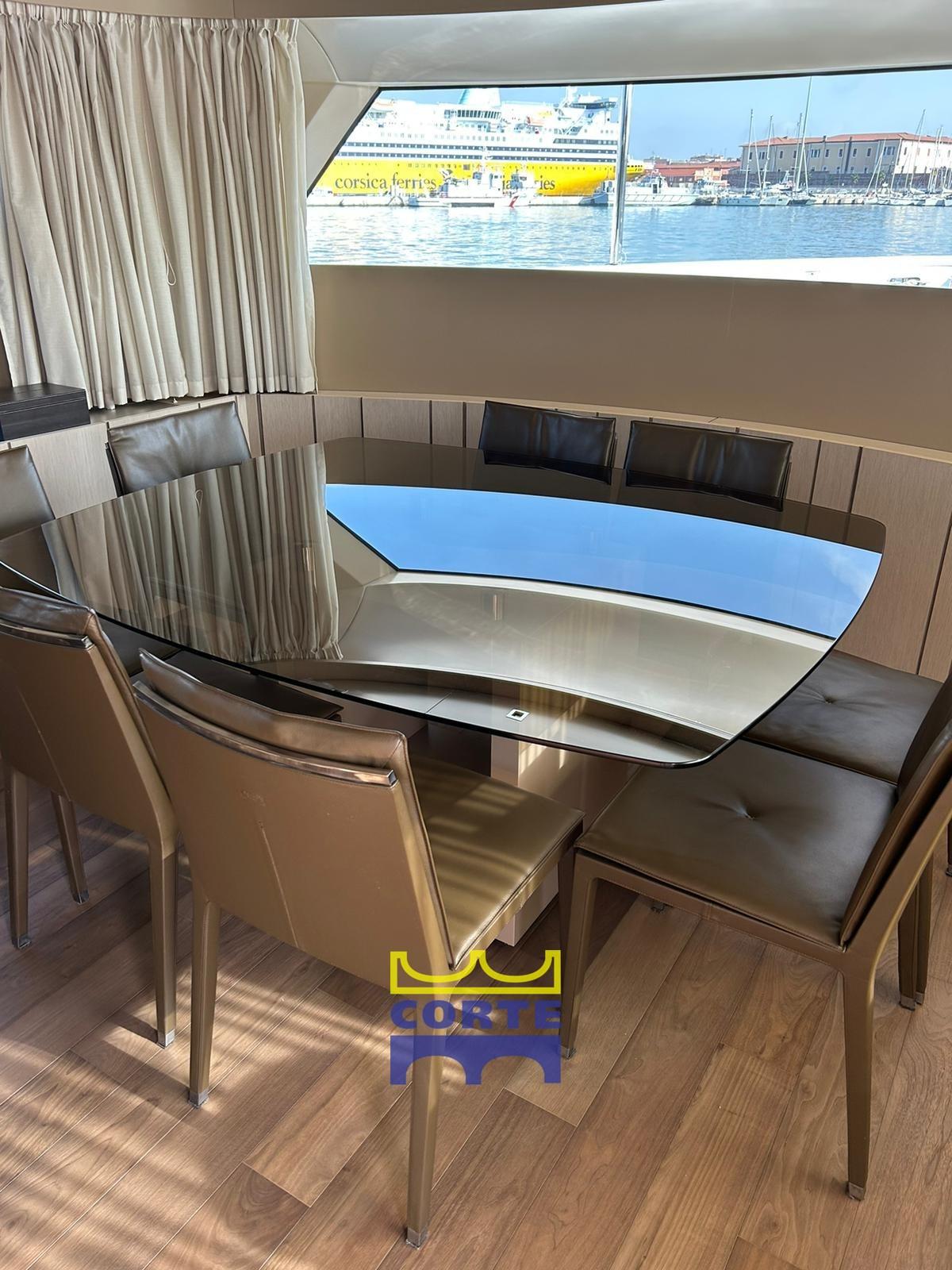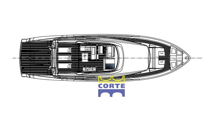 Sellerie complète, Coussins arrieres, Coussin avant, Sellerie de fly, sellerie de cockpit, Rideaux occultants (elettrici a rullo per oblò cabina master), Taud de soleil (fly a poppa dell'hard top).