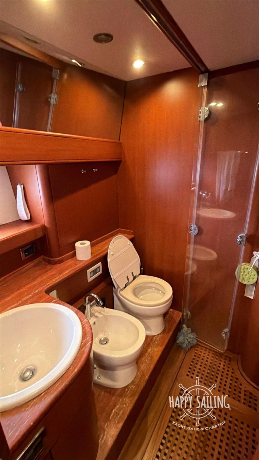Alarme moteur, Eau sous pression, Douche de cockpit, Flaps hydrauliques, Éclairage de courtoisie, Passerelle (idraulica), Plateforme arrière (teak), Pompe de cale manuelle, Cockpit en teck, Prise de quai, Guindeau électrique, Echelle de bain, table de cockpit.