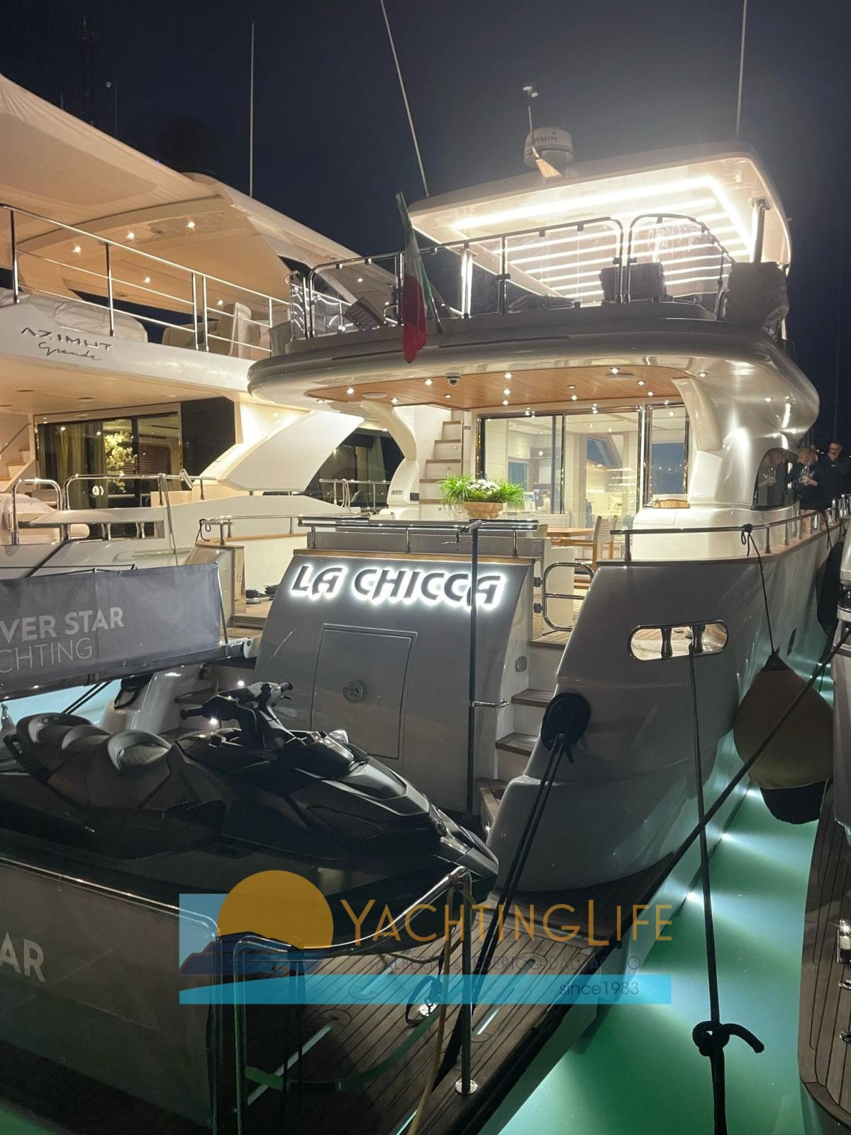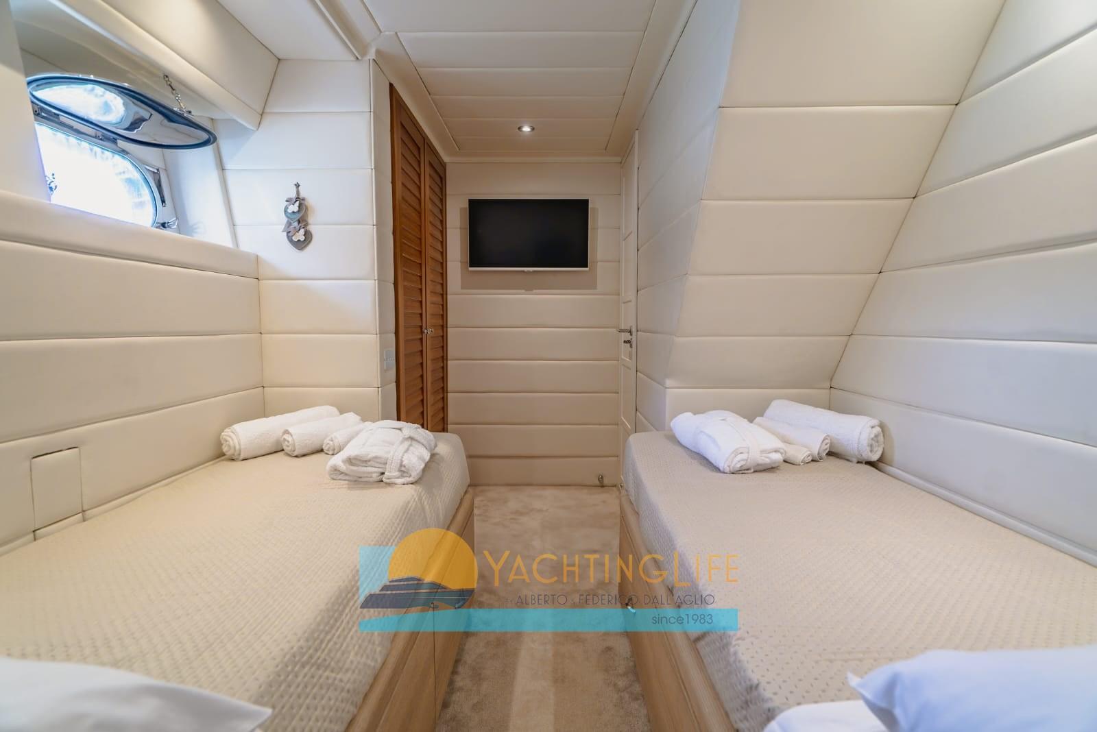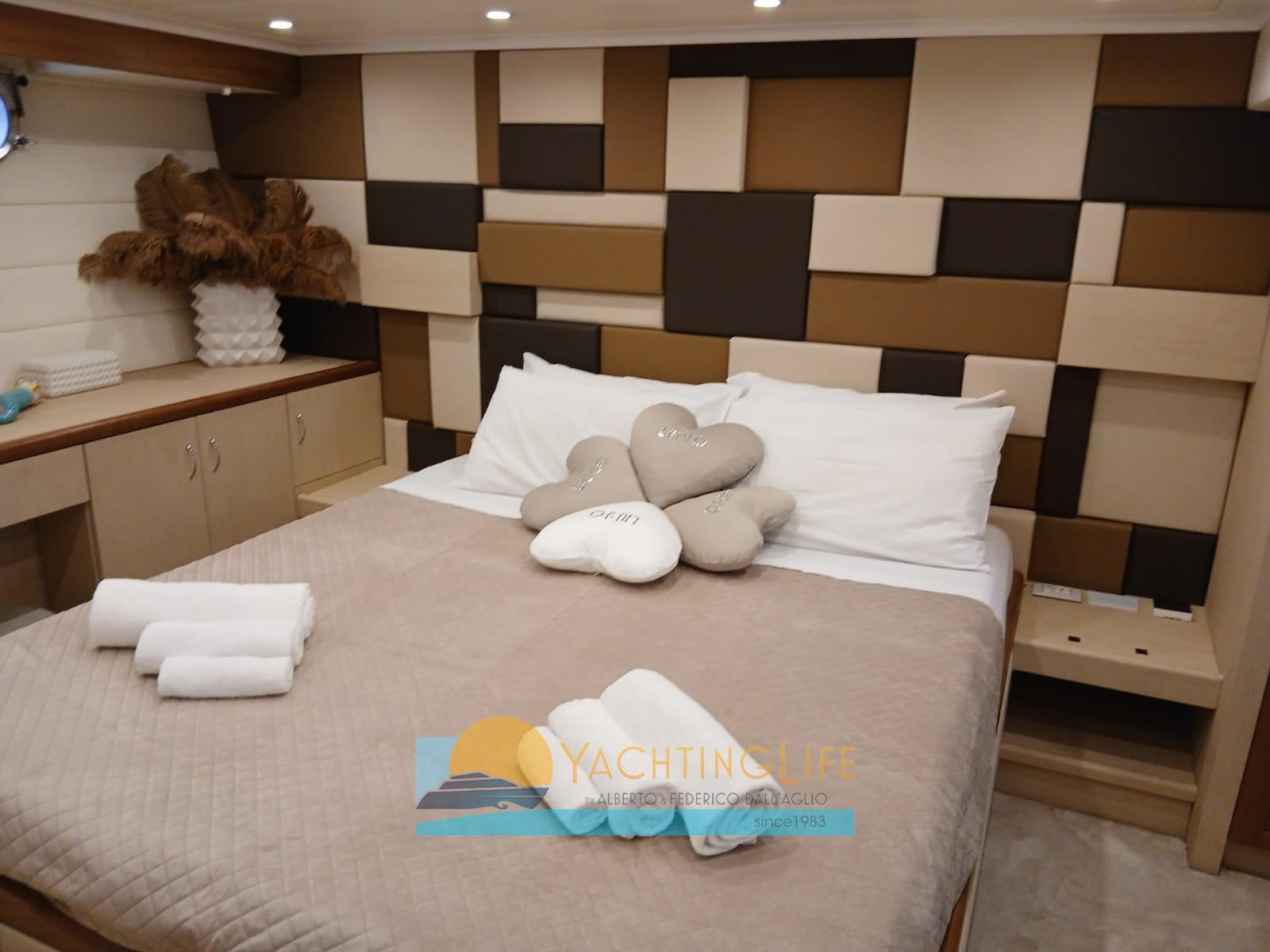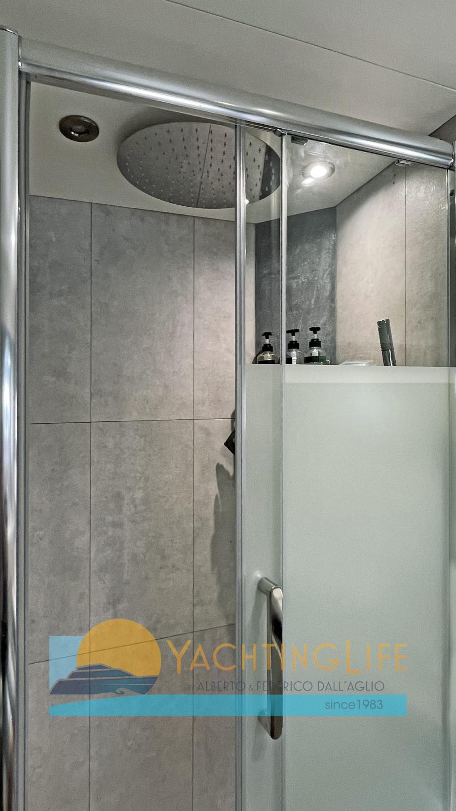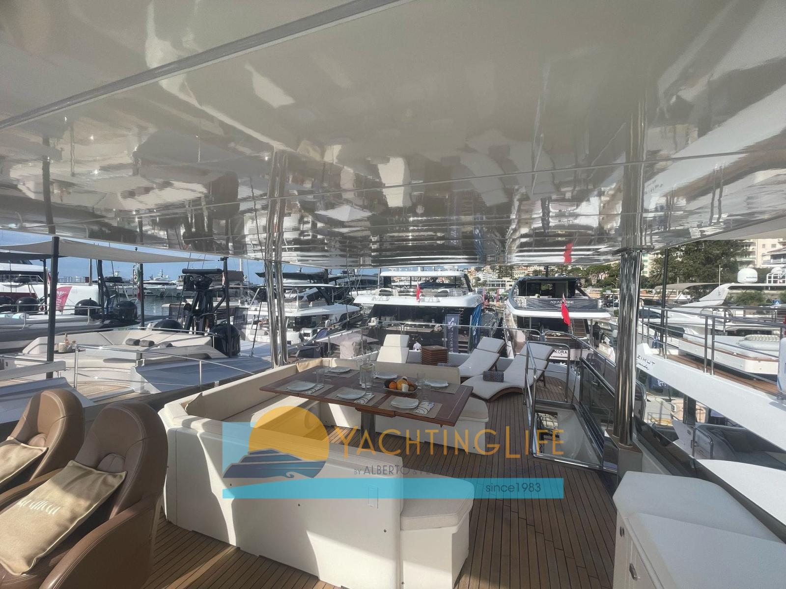 Alarme moteur, Alarme de pompe de cale, Alternateur, Eau sous pression, 2 Radeau de sauvetage, Batteries (al litio), Passavant en teck, 3 Chargeur de batterie, Douche de cockpit, Double barre à roue, Propulseur d'étrave (Vetus 48v 13kw), Flaps hydrauliques, Hard top (con pannelli fotovoltaici), Extincteur(s) fixe(s), Indicateurs de flaps, Lavabo dans le cockpit, Éclairage de courtoisie, Spots sous-marins, Panneau solaire, Passerelle (idraulica), Plateforme arrière (idraulica), Pompe de cale automatique, Pont en teck, Porte latérale, Porte latérale, Cockpit en teck, Prise de quai, Guindeau électrique, Echelle de bain, Stabilisateurs (Tomei ARG 250), table de cockpit, Annexe, Corne, 2 Winch électrique arrière.