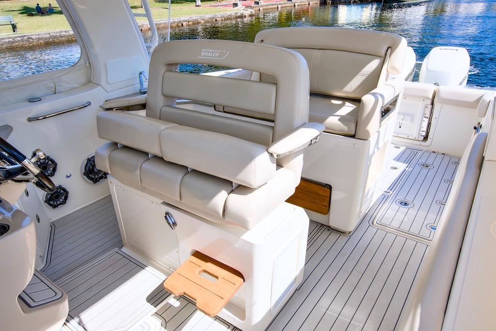 - Robust forward console lounge includes fold-down armrests and drink holders, with forward island deck seating opposite.