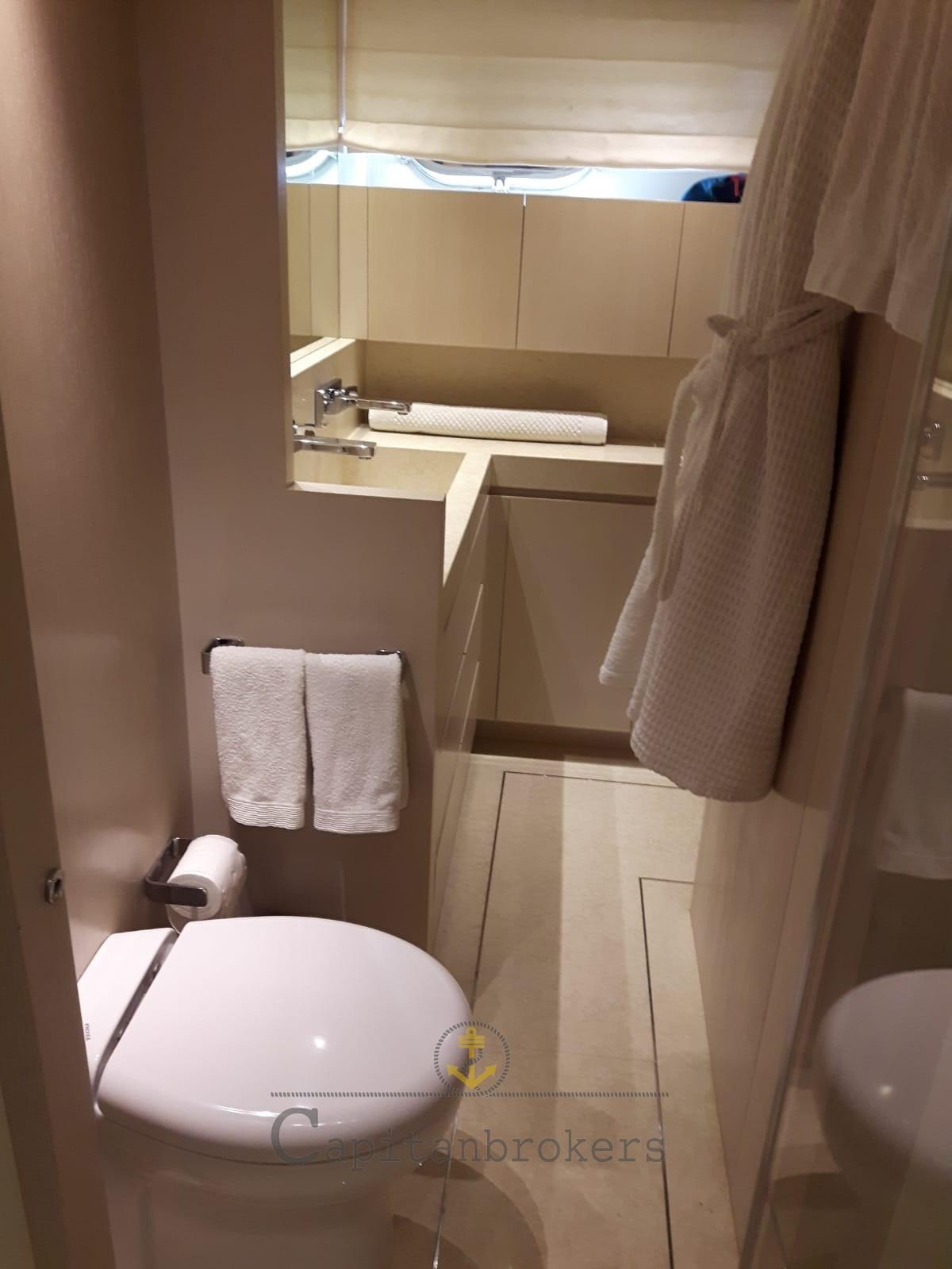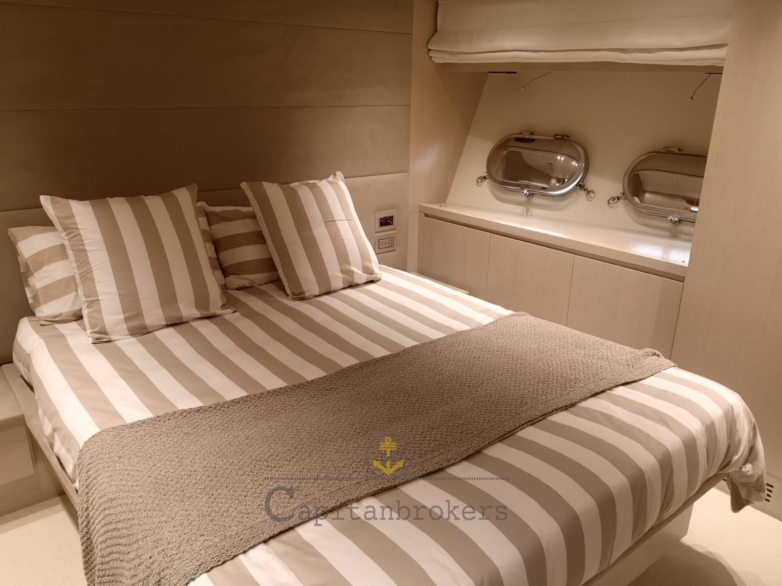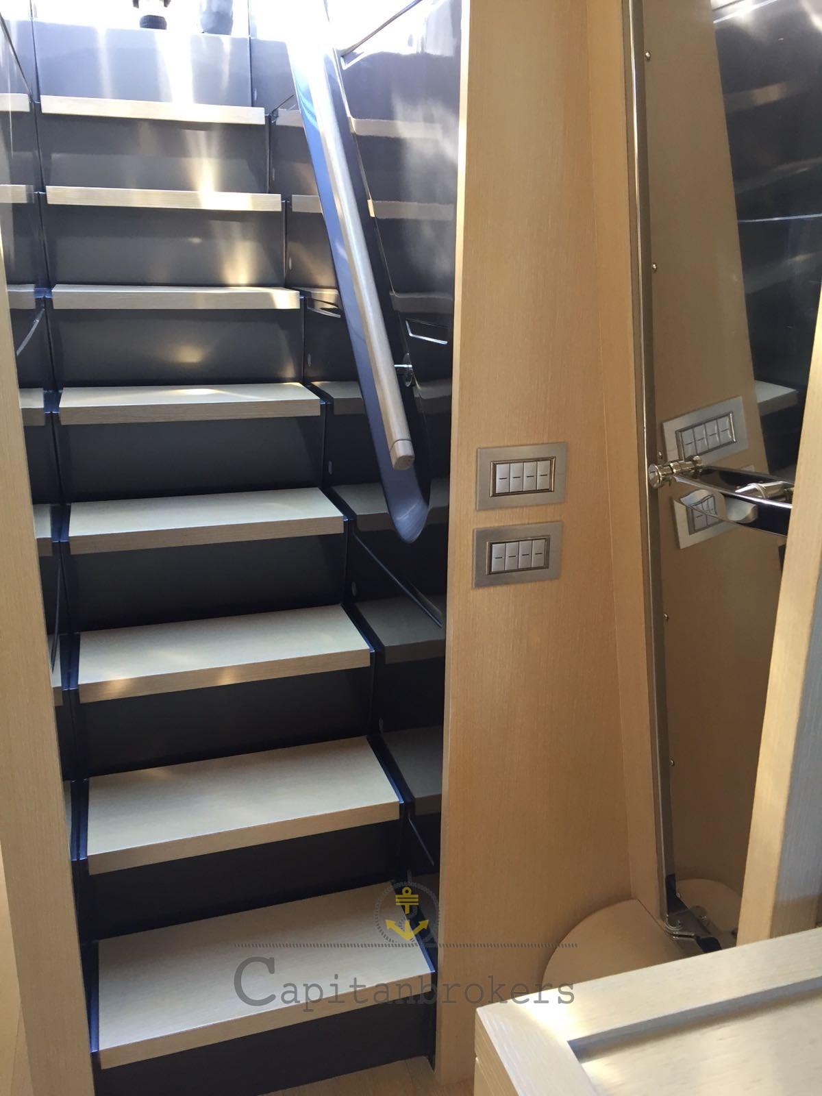 Alarme moteur, Alarme de pompe de cale, Eau sous pression, Douche de cockpit, Double barre à roue, Phare de poursuite, Flaps électriques, Bossoirs, Grue de flybridge, Extincteur(s) fixe(s), Passerelle, Plateforme arrière, Pompe de cale automatique, Porte latérale, Cockpit en teck, Prise de quai, Connexion eau sous pression à quai, Guindeau électrique, Echelle de bain, Stabilisateurs (Pinne stabilizzatrici), table de cockpit, Annexe, Winch électrique arrière, Winch électrique avant.