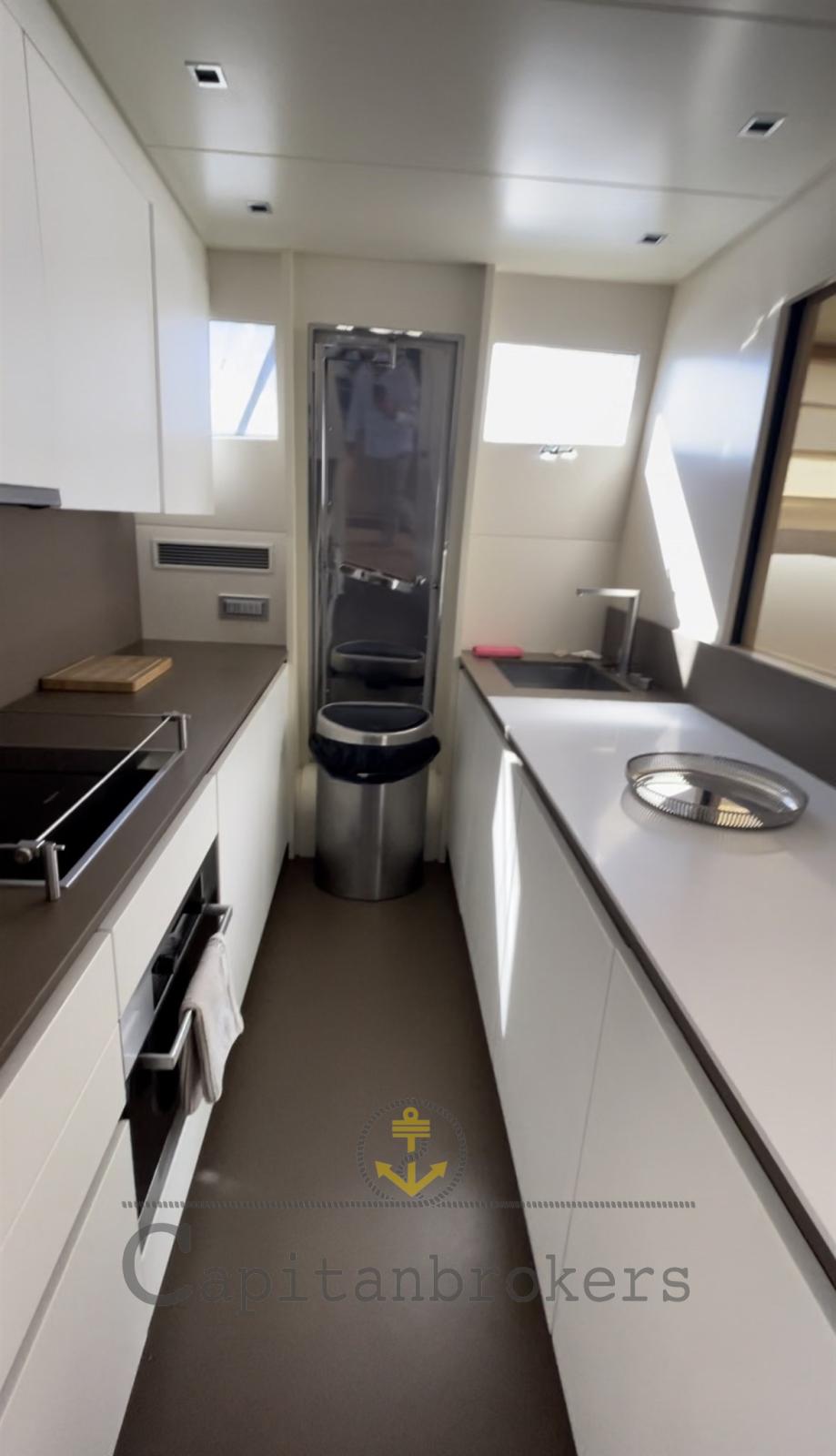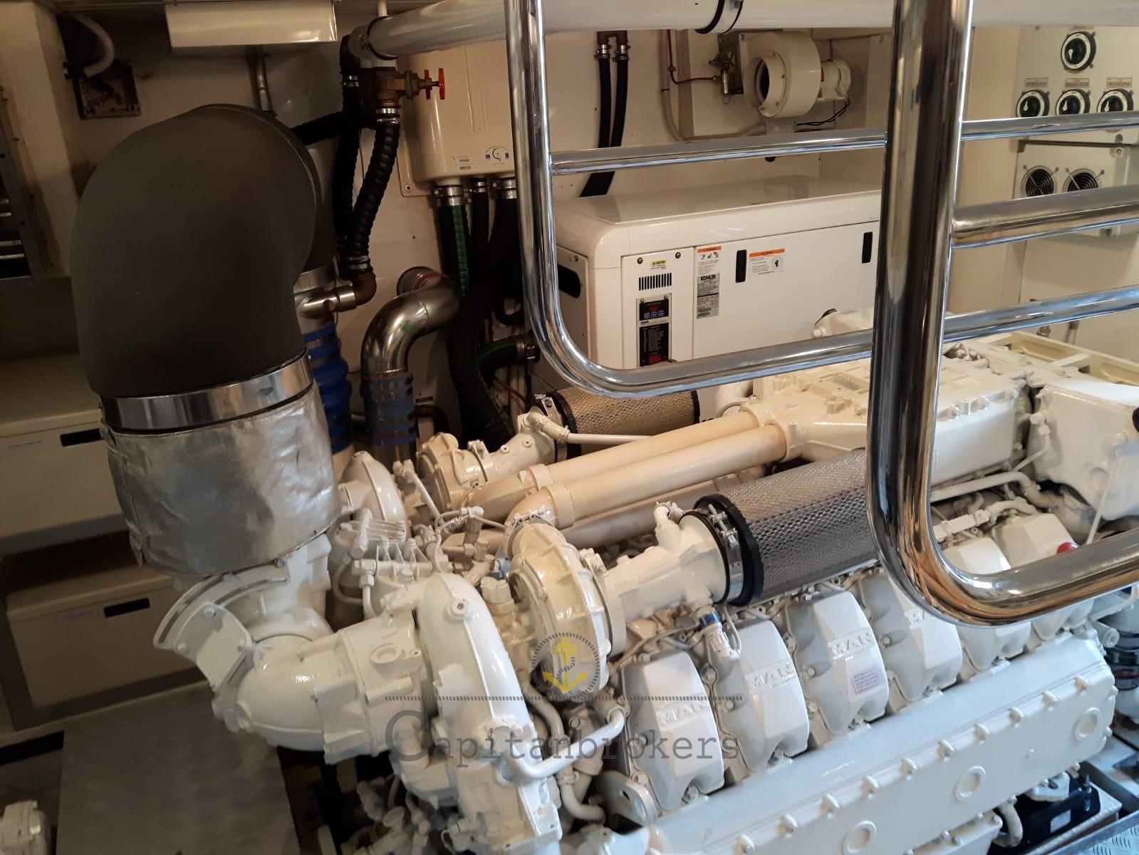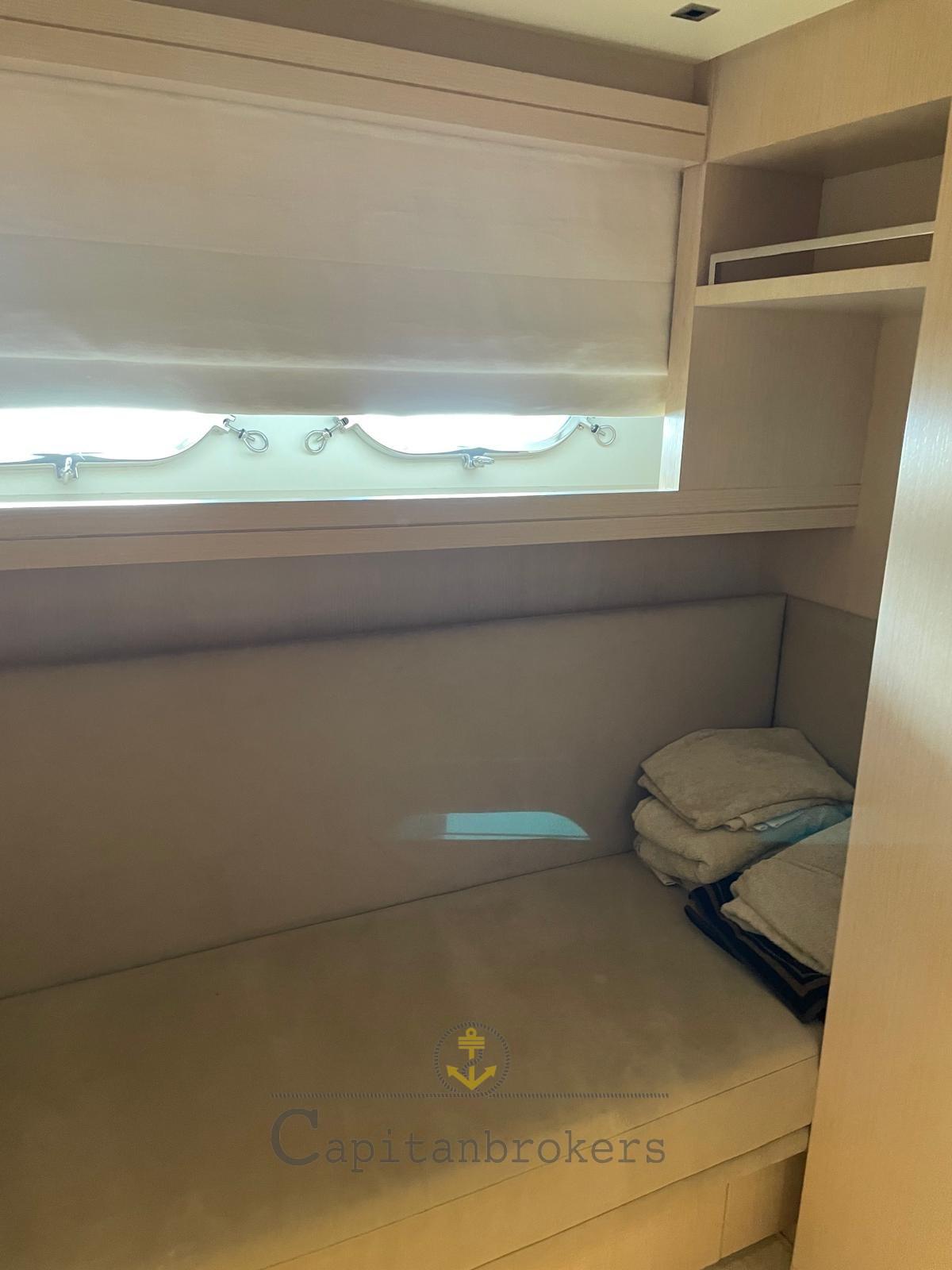 Alarme moteur, Alarme de pompe de cale, Eau sous pression, Douche de cockpit, Double barre à roue, Phare de poursuite, Flaps électriques, Bossoirs, Grue de flybridge, Extincteur(s) fixe(s), Passerelle, Plateforme arrière, Pompe de cale automatique, Porte latérale, Cockpit en teck, Prise de quai, Connexion eau sous pression à quai, Guindeau électrique, Echelle de bain, Stabilisateurs (Pinne stabilizzatrici), table de cockpit, Annexe, Winch électrique arrière, Winch électrique avant.