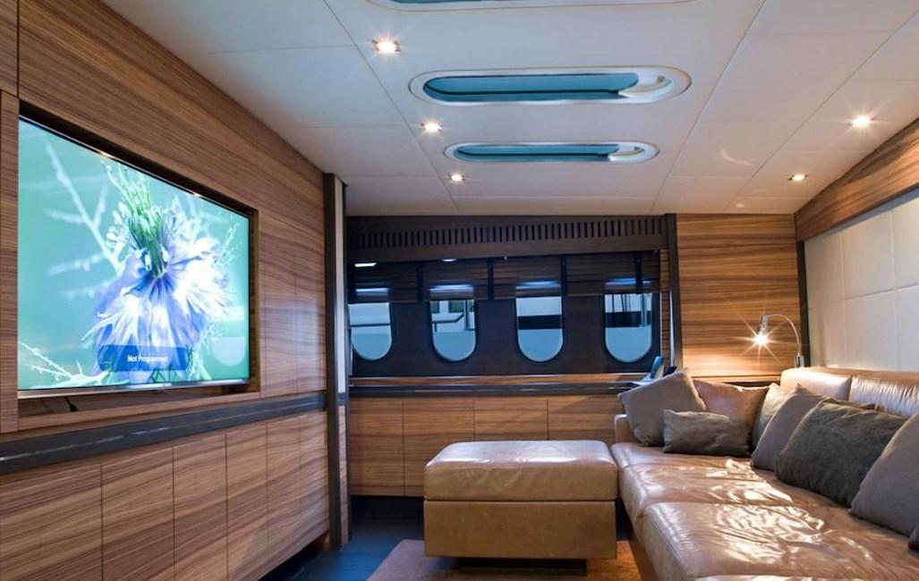 Hall d’entrée avec coin salon, avec canapé en L à gauche, canapé avec tables pliantes à tribord | Bar d’angle central derrière la timonerie avec toit panoramique | Salle home cinéma à l’avant avec TV 3D 60" qui se transforme en une 5ème cabine double avec canapé-lits et salle de bain