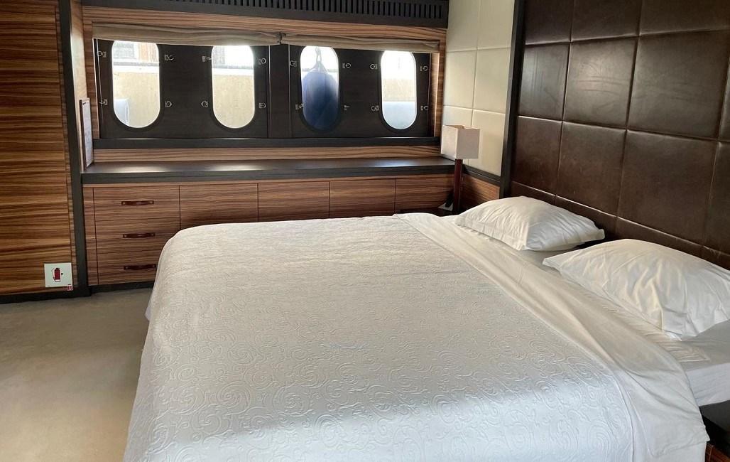 Suite propriétaire au milieu du navire, lit king size, coin salon, télévision grand écran et salle de bain attenante | Cabine VIP à l’avant avec lit king size, coin salon, télévision grand écran et salle de bain attenante | Cabine invités avec lit double, télévision grand écran et salle de bain privée à tribord, entre la cabine VIP et la cabine principale | Cabine d’invités avec lits plats, autocar en option, télévision grand écran et salle de bain privée sur la gauche | Cabine équipage avec lits plats et salle de bain privée avec entrée indépendante depuis le coqueron avant | Cabine du capitaine avec lit simple, cabine de l’équipage avec lits superposés, cuisine et buanderie au milieu du navire et salle des machines à l’arrière