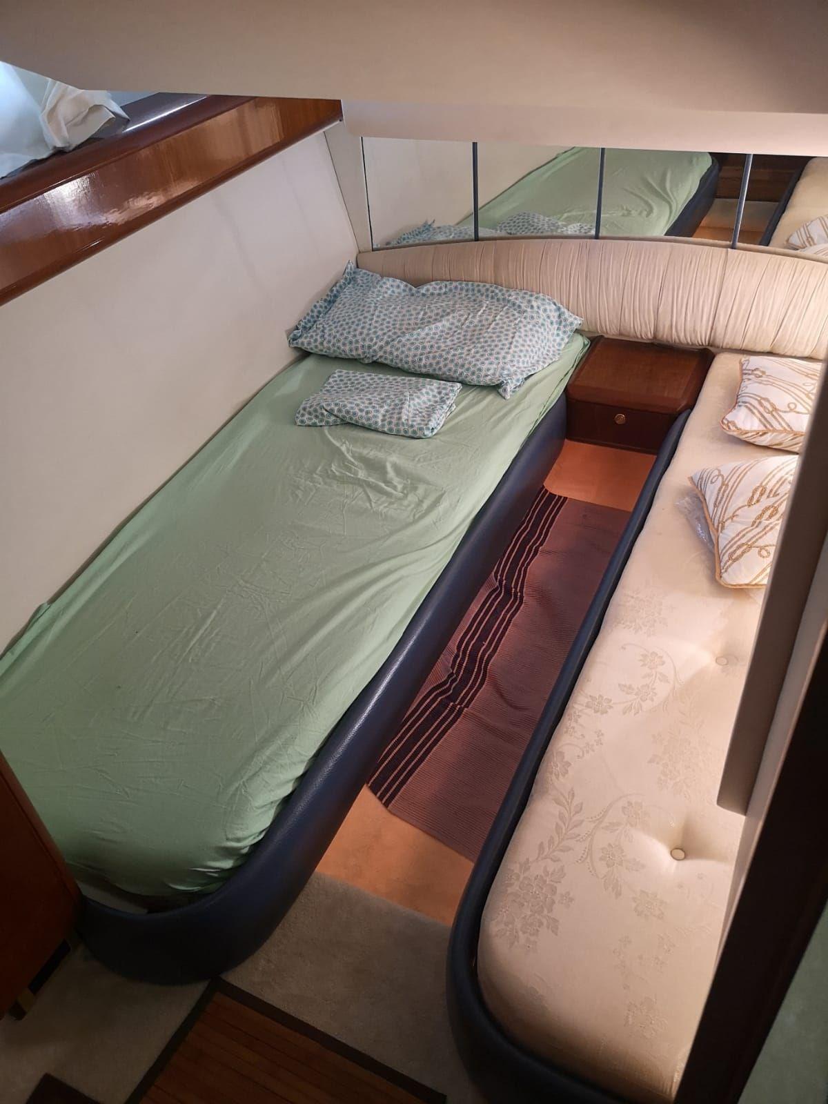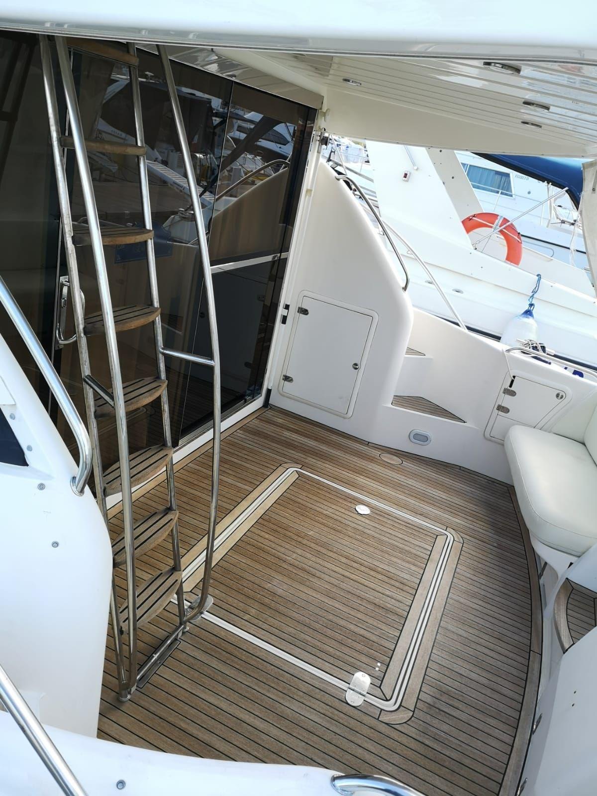 Alarme gaz, Alarme moteur, Alarme de pompe de cale, Eau sous pression, Douche de cockpit, Flaps électriques, Extincteur(s) fixe(s), Éclairage de courtoisie, Spots sous-marins, Passerelle, Plateforme arrière, Pompe de cale automatique, Pompe de cale manuelle, Cockpit en teck, Prise de quai, Onduleur, Rollbar, Guindeau électrique, Echelle de bain, Corne.