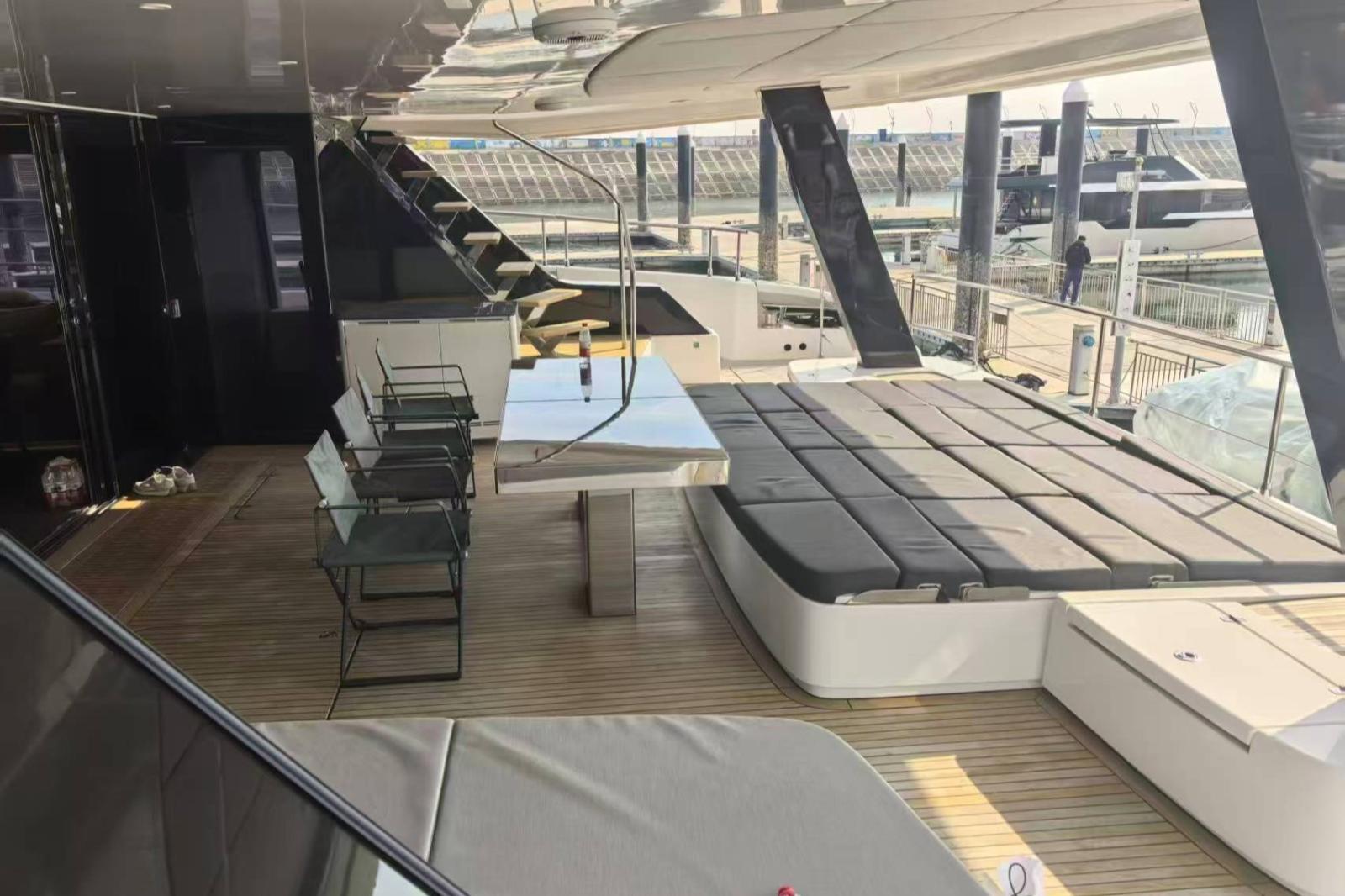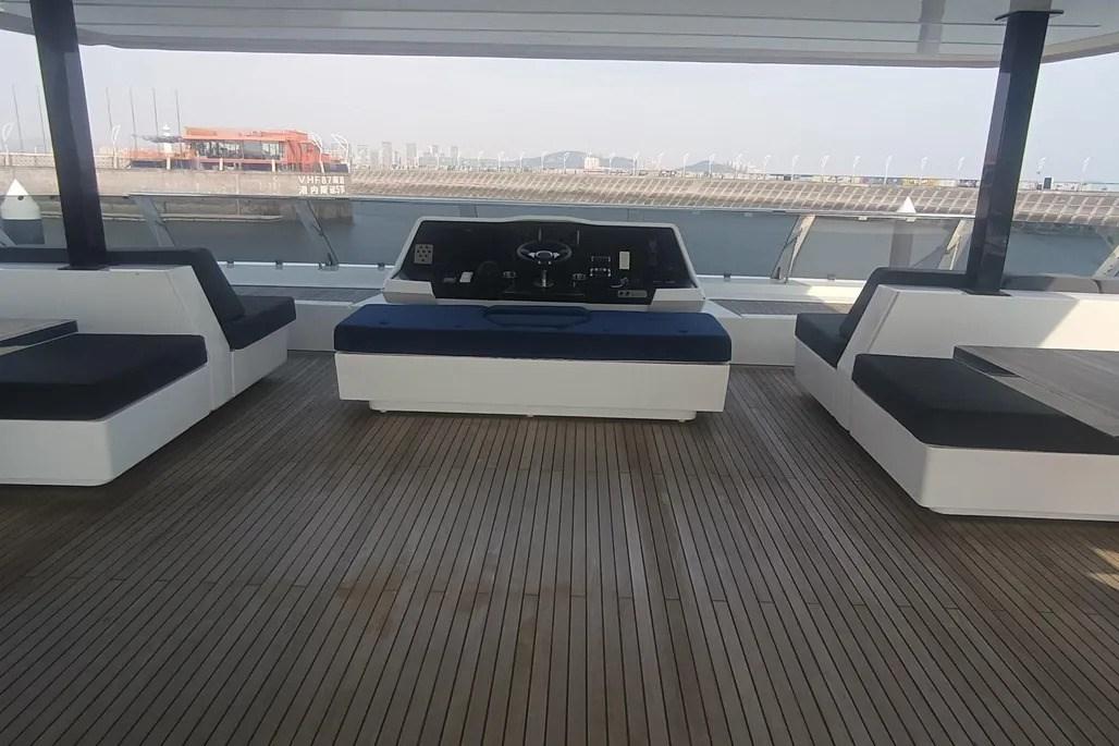 Le cockpit arrière offre un espace suffisant pour la détente et la restauration. Sous le canapé modulaire, le garage abrite un grand jet ski et des jouets aquatiques, tandis que la plateforme de bain hydraulique abrite le tender et offre un espace supplémentaire pour se détendre au bord de la mer