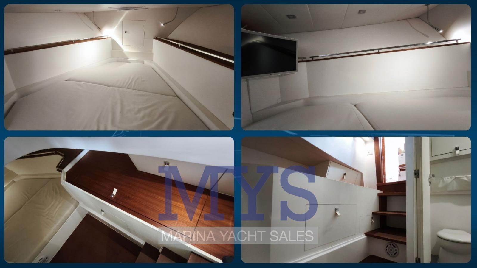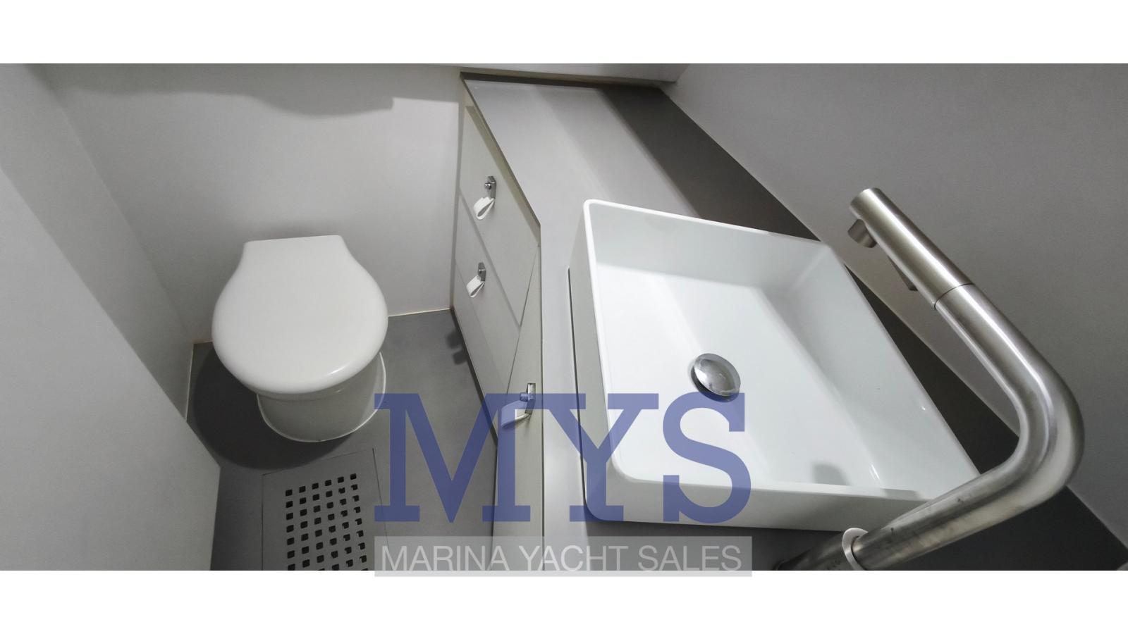 Une cabine double à la proue dans un espace open space et une salle de bain séparée avec douche offrent confort et fonctionnalité