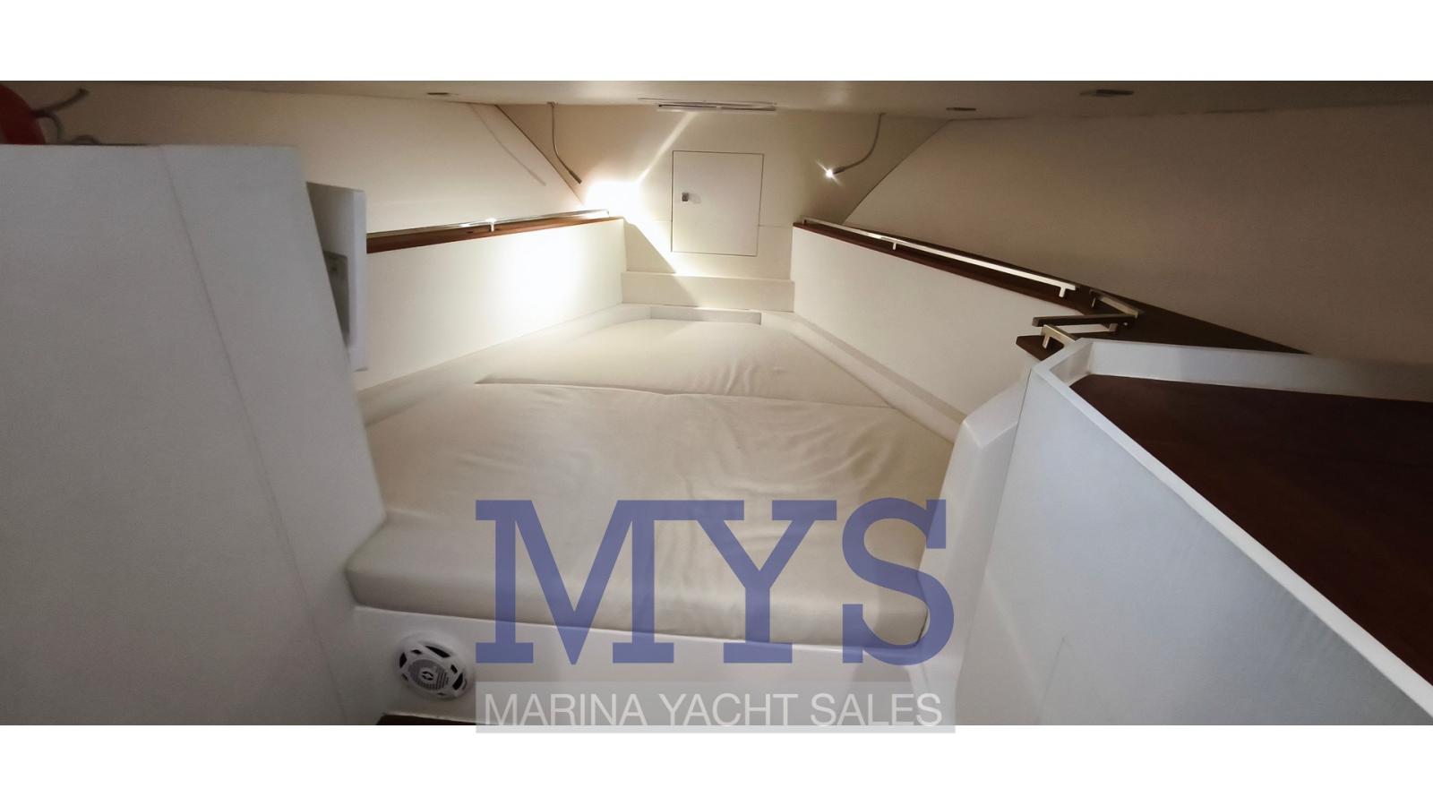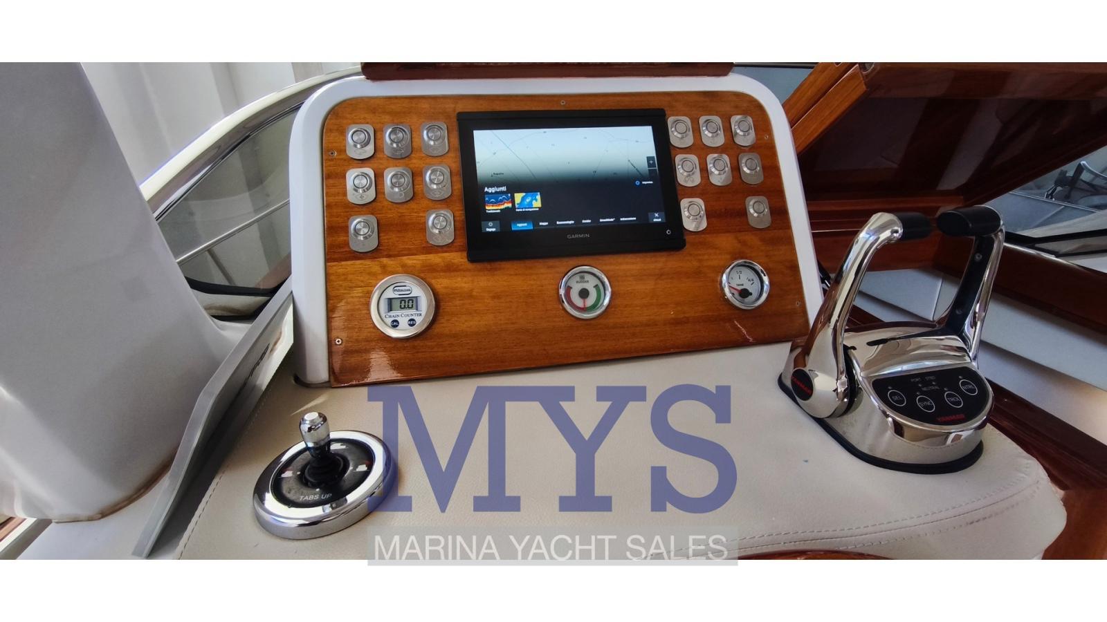 Indicateur d'angle de barre, Commande électrique, Ordinateur fixe de bord, Compteur de chaîne, DSC VHF (Garmin), Sondeur pêche (Garmin 9), GPS (Garmin 9), Joystick (per i Flaps), Cartes et guides, Moniteur de consommation, Siège copilote.