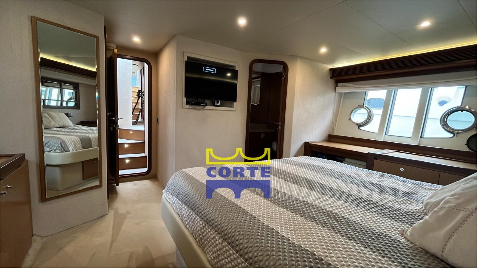 La cabine du propriétaire est équipée d’une grande armoire et d’une grande salle de bain avec douche séparée avec sol en teck. À l’entrée, la sensation d’espace est remarquable et encouragée par la grande luminosité offerte par les fenêtres ouvertes de chaque côté, avec des hublots pouvant s’ouvrir pour permettre la ventilation de la cabine