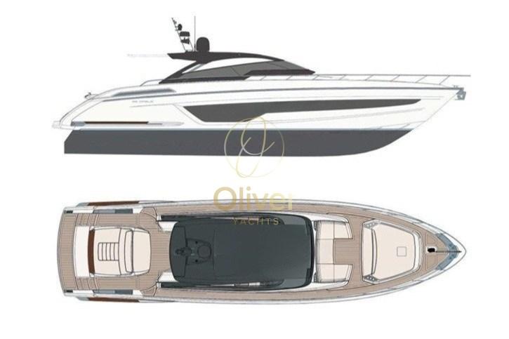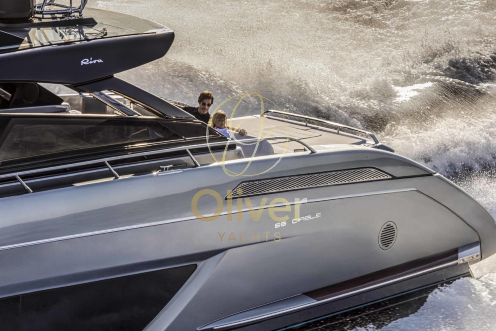 Ce Riva 68' Diable est un yacht sportif ouvert de dernière génération qui interprète le concept de yacht de jour dans un style contemporain. Les lignes sont tendues mais harmonieuses, avec un profil épuré qui exprime la performance sans sacrifier l’élégance typique de la marque. Le pont est organisé de manière rationnelle : grande zone de bronzage à la proue, cockpit convivial avec dinette et bar humide, passerelles sûres et bien dimensionnées.
