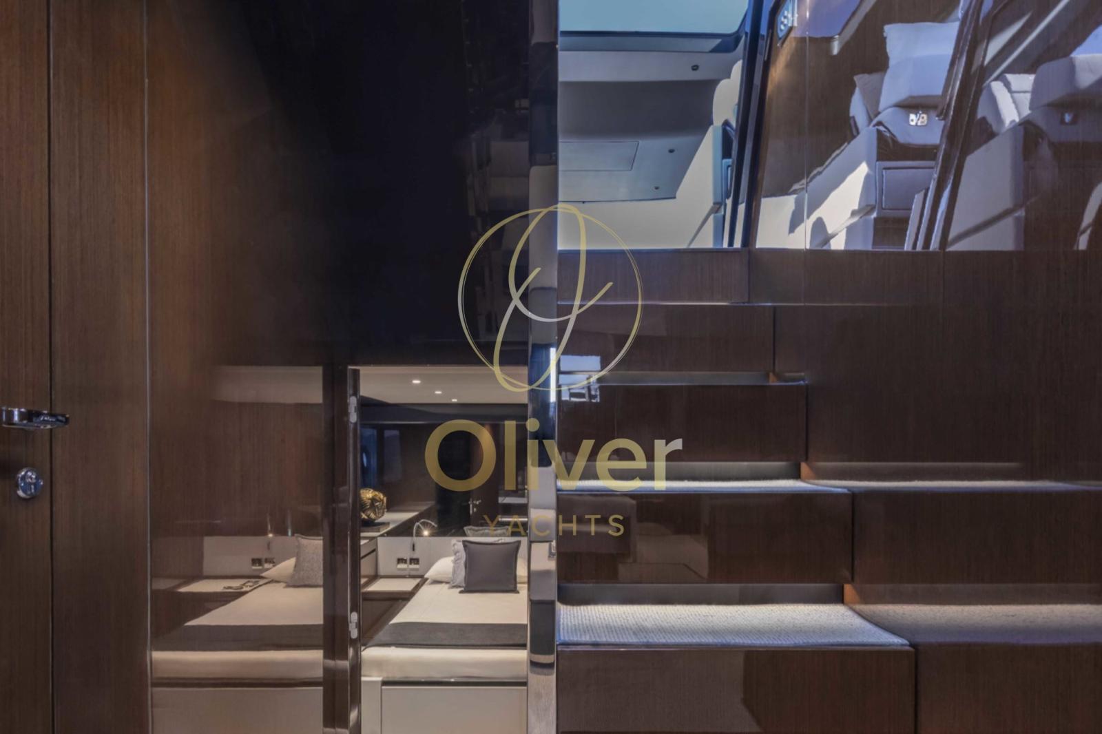 L’intérieur du Riva 68' Diable reflète un cadre moderne et fonctionnel, avec une disposition conçue pour garantir le confort de croisière. Le salon principal, situé sur la terrasse inférieure, est lumineux et bien organisé, avec une salle à manger et un espace détente intégrés dans un espace linéaire et facilement utilisable.