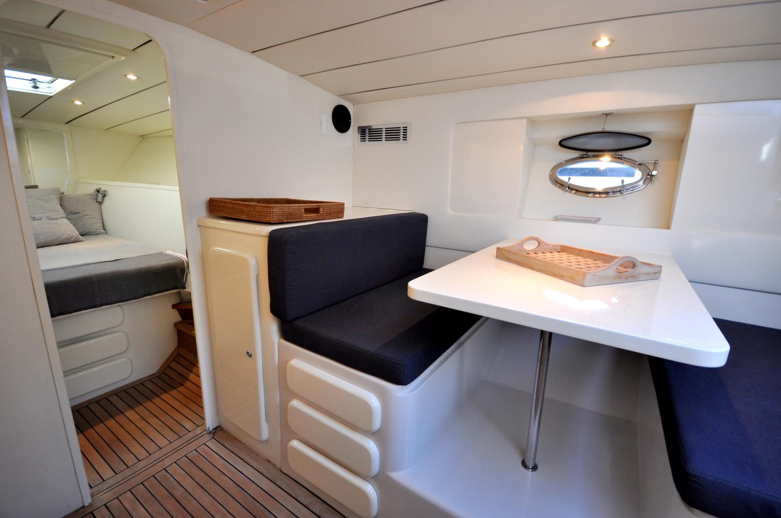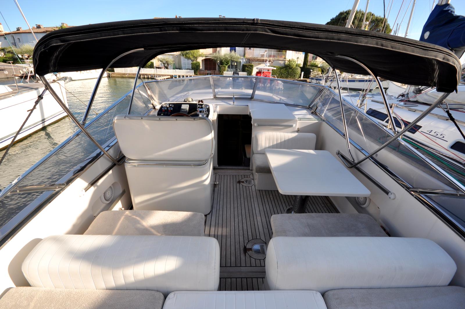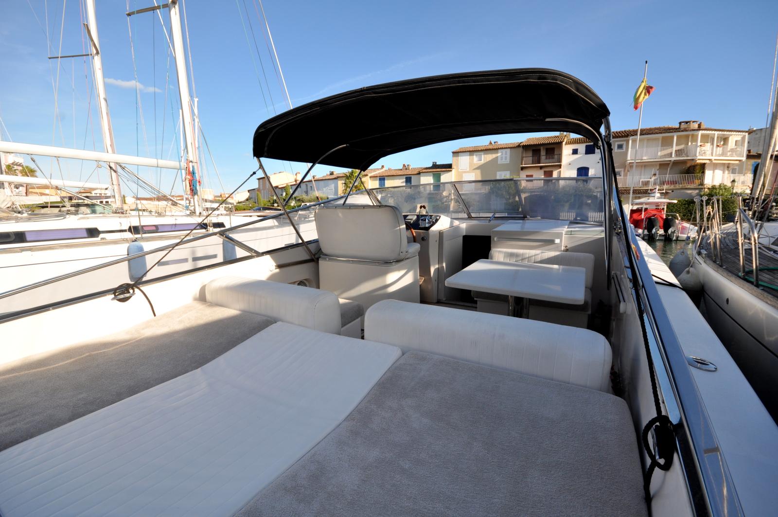 Le cockpit spacieux offre un bel espace de vie extérieur, parfaitement adapté à la détente et aux moments de convivialité en mer. À l’intérieur, le bateau propose un aménagement fonctionnel avec une cabine confortable, un espace salon et une salle d’eau, permettant d’envisager également des escapades de courte durée.