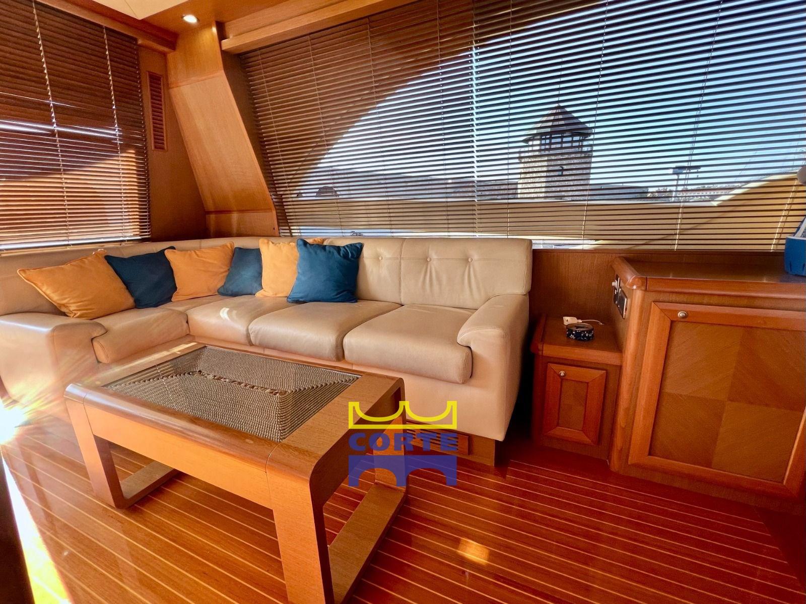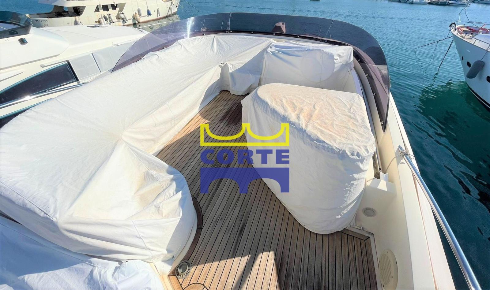 Alarme moteur, Alarme de pompe de cale, Ancre (Bruce inox), Eau sous pression, Passavant en teck, Couleur spéciale (azzurro), Douche de cockpit, Double barre à roue, Phare de poursuite, Flaps hydrauliques, Garage à annexe (ad apertura elettroidraulica), Extincteur(s) fixe(s), Lavabo dans le cockpit, Éclairage de courtoisie, Spots sous-marins (sotto plancetta di poppa), Passerelle (elettroidraulica a scomparsa), Plateforme arrière (poppa per bagno), Pompe de cale automatique, Porte latérale, Cockpit en teck, Prise de quai, Connexion eau sous pression à quai, Répétiteur électronique, Guindeau électrique, Echelle de bain, Stabilisateurs (Arg Mitsubishi), table de cockpit (con 2 divani), Annexe (recente con alaggio facilitato), Corne, Winch électrique (prua), 2 Winch électrique arrière, Winch électrique avant.