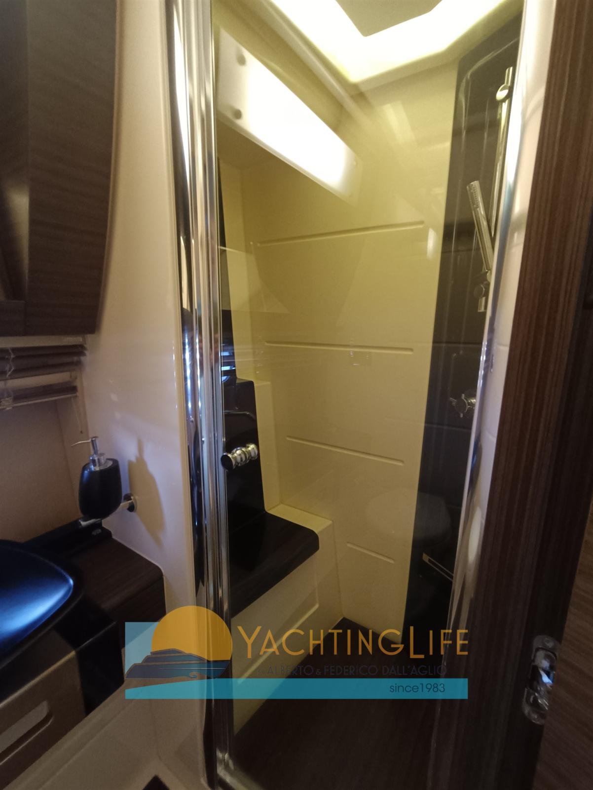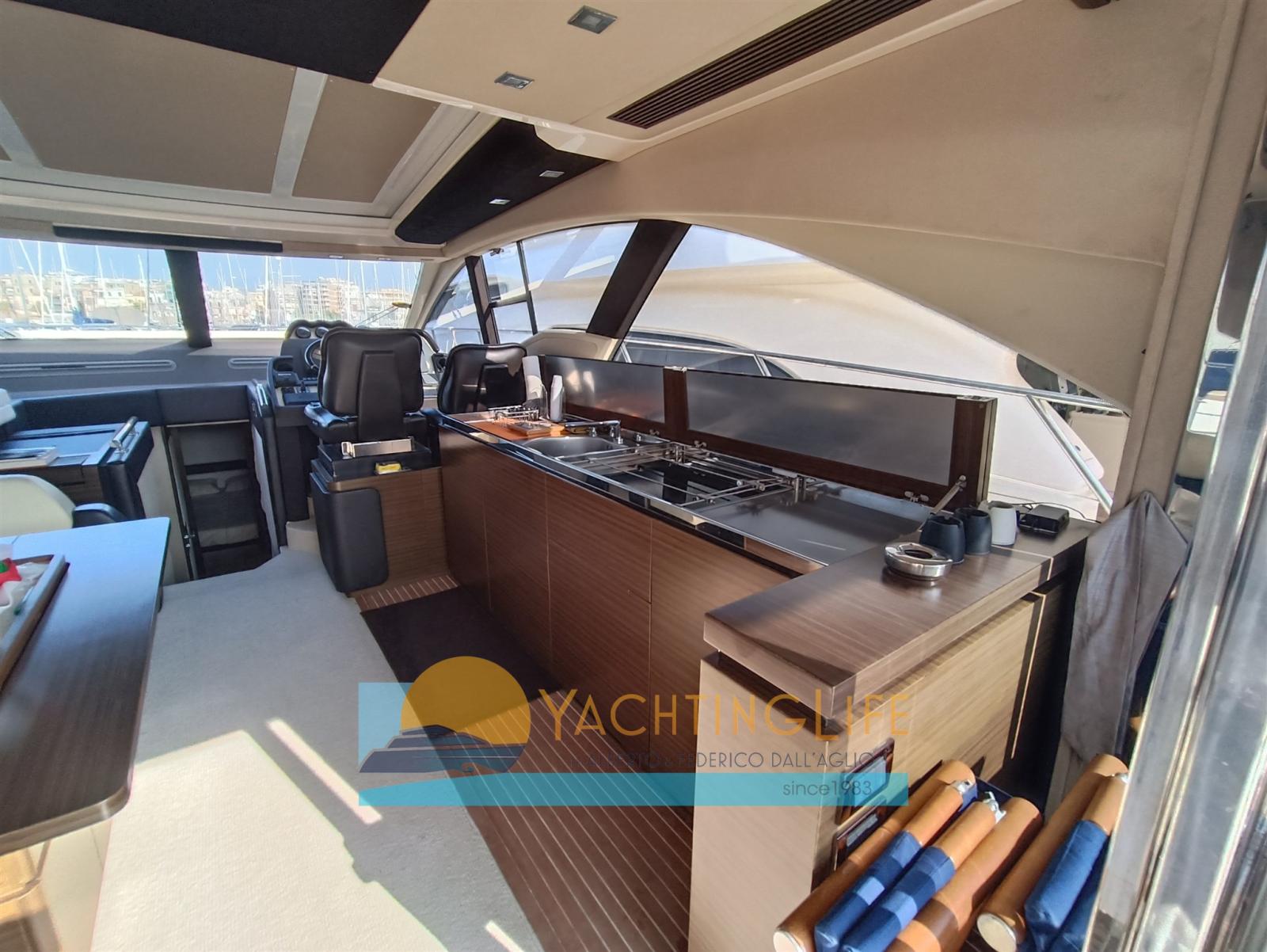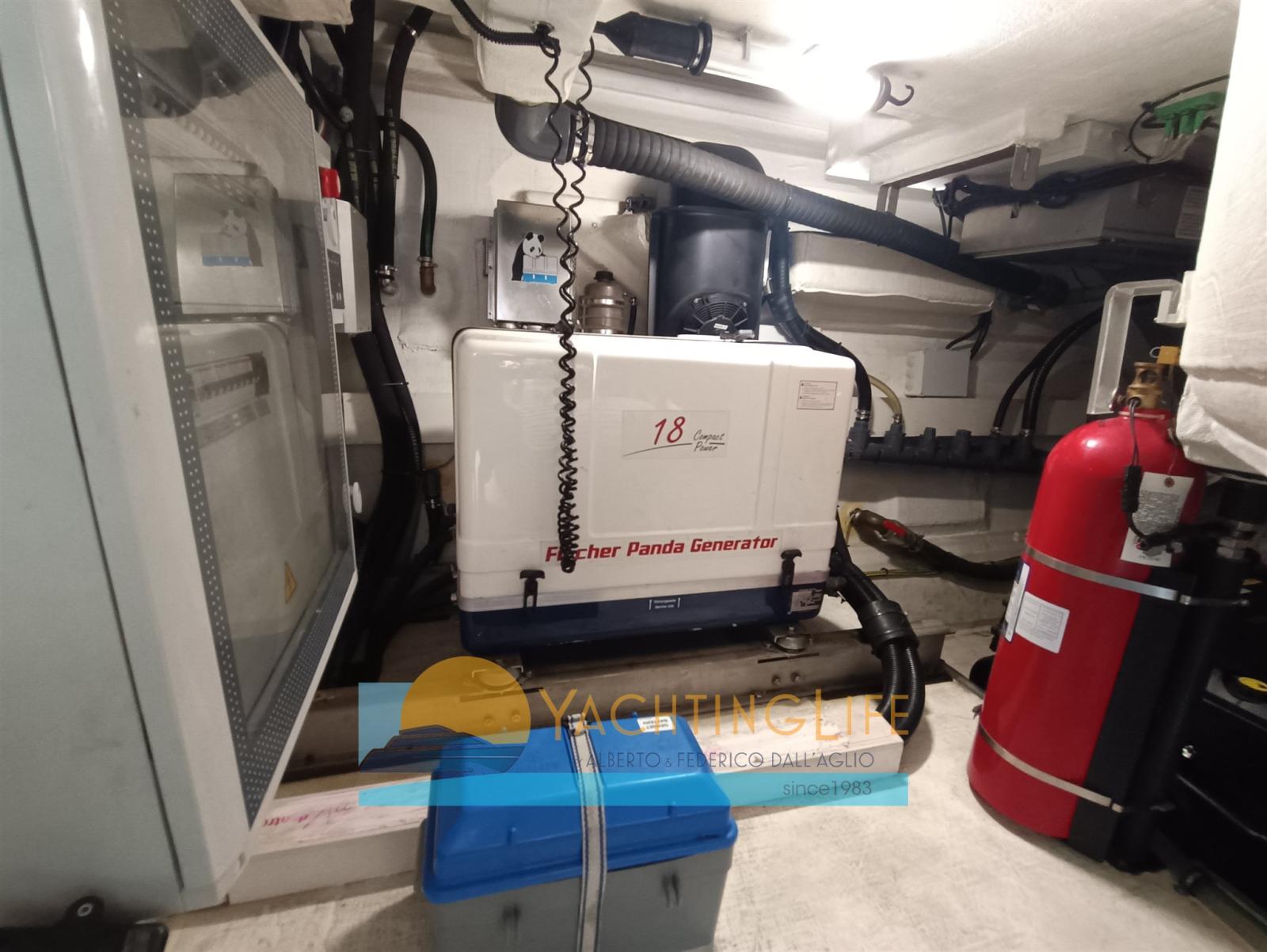Alarme moteur, Alarme de pompe de cale, Eau sous pression, Douche de cockpit, Flaps électriques, Garage à annexe, Hard top, Indicateurs de flaps, Éclairage de courtoisie, Passerelle (idraulica a scomparsa), Plateforme arrière (idraulica), Pompe de cale automatique, Porte latérale, Cockpit en teck, Prise de quai, Guindeau électrique, Echelle de bain, Selles pour Annexe, table de cockpit, Corne, Winch électrique arrière.