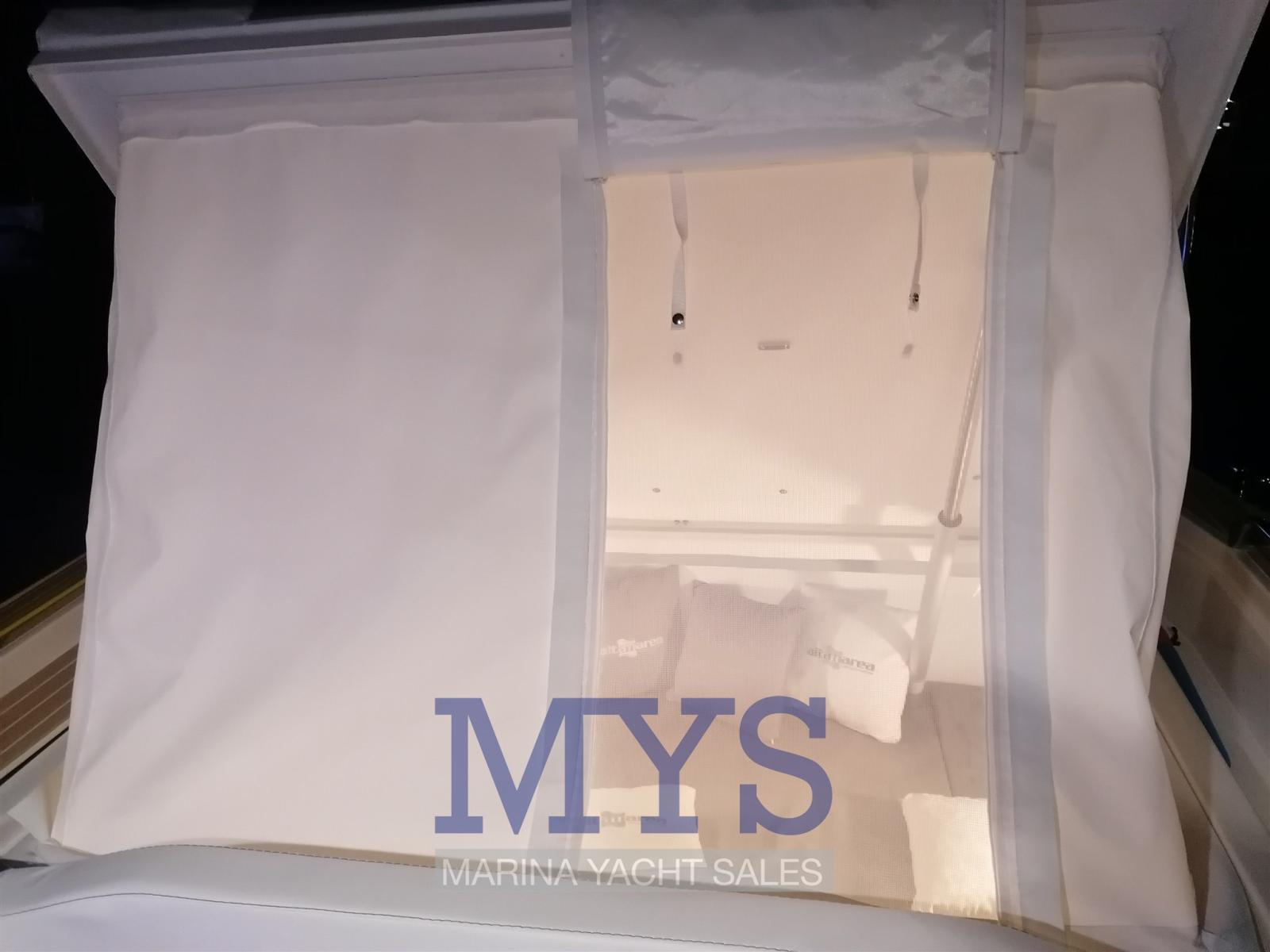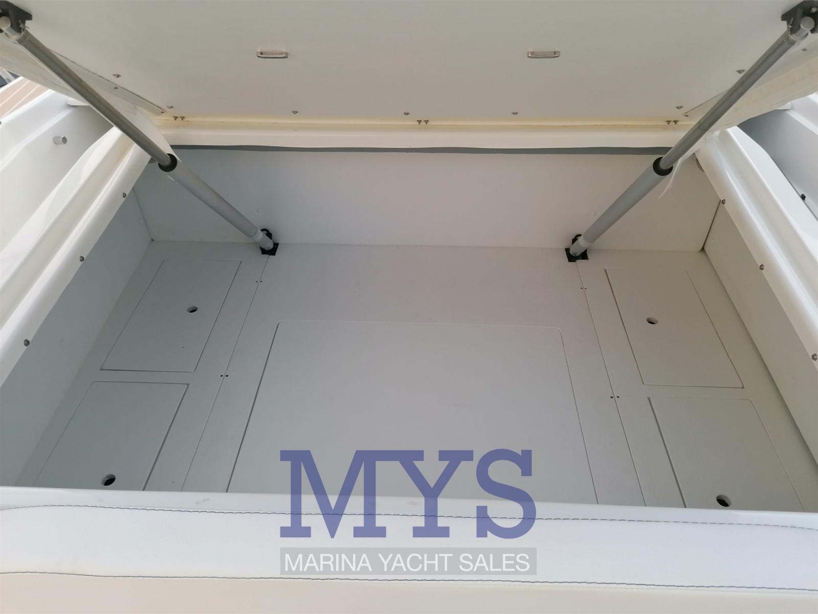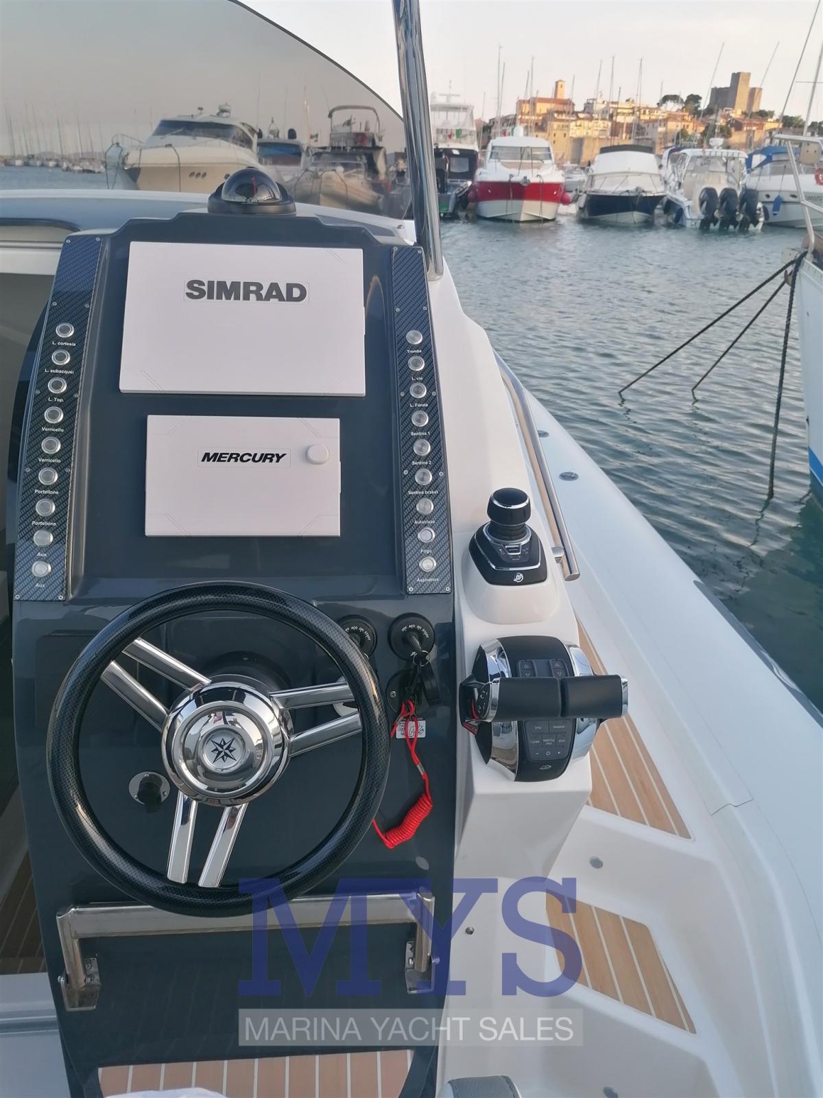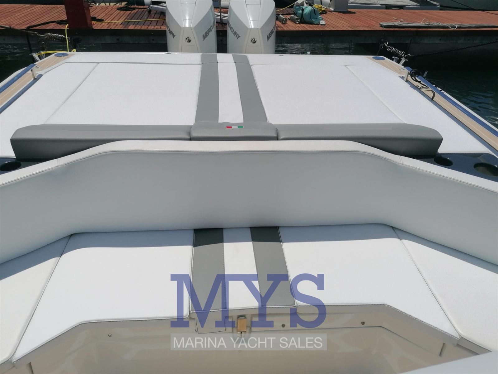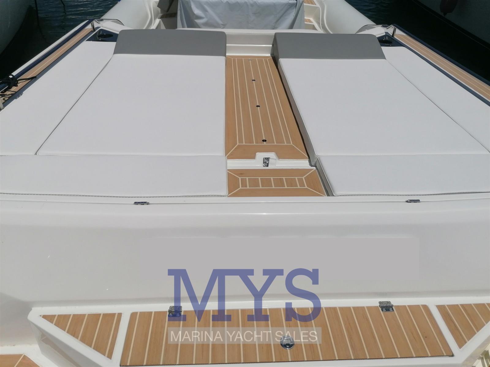Alarme moteur, Ouverture du compartiment moteur électrique, Eau sous pression, Douche de cockpit, Éclairage de courtoisie, Spots sous-marins, Plateforme arrière, Pompe de cale automatique, Pompe de cale manuelle, Cockpit en teck, Prise de quai, Guindeau électrique, Echelle de bain, Table, Corne.