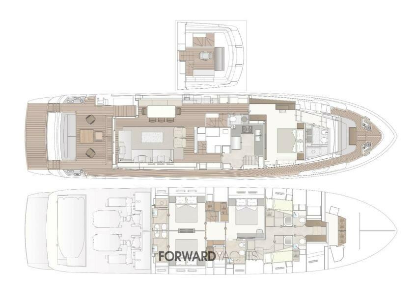 équipé d’un salon meublé par Minotti avec refroidisseur à vin et d’un grand flybridge complet avec un bar et