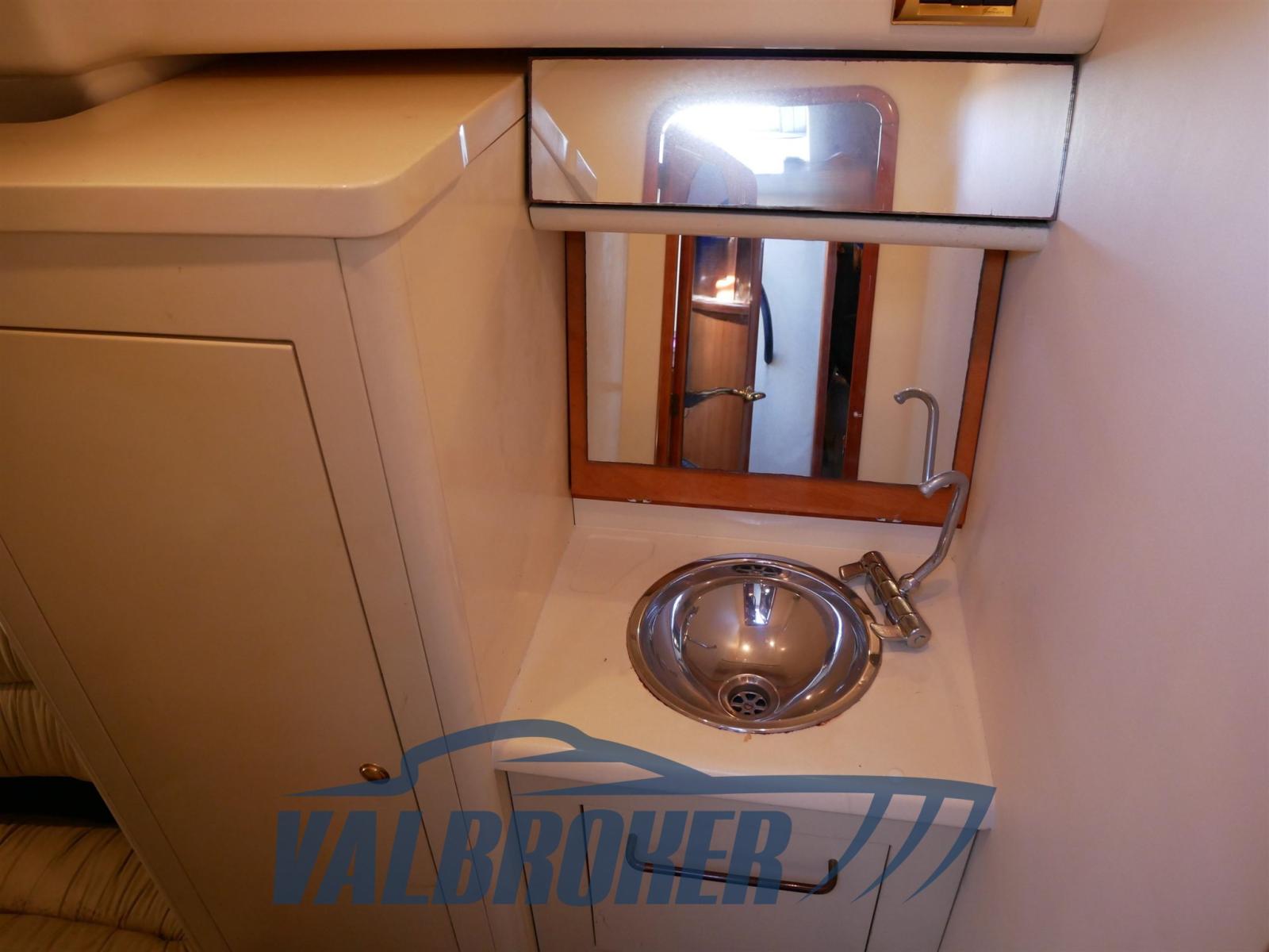 Sous le pont, il y a une spacieuse cabine double arrière, une salle à manger décapotable et une salle de bain avec douche. En option complète : climatisation chaud/froide, pilote automatique, propulseur d’étrave, garage à tender, GPS. Teck synthétique sans entretien.