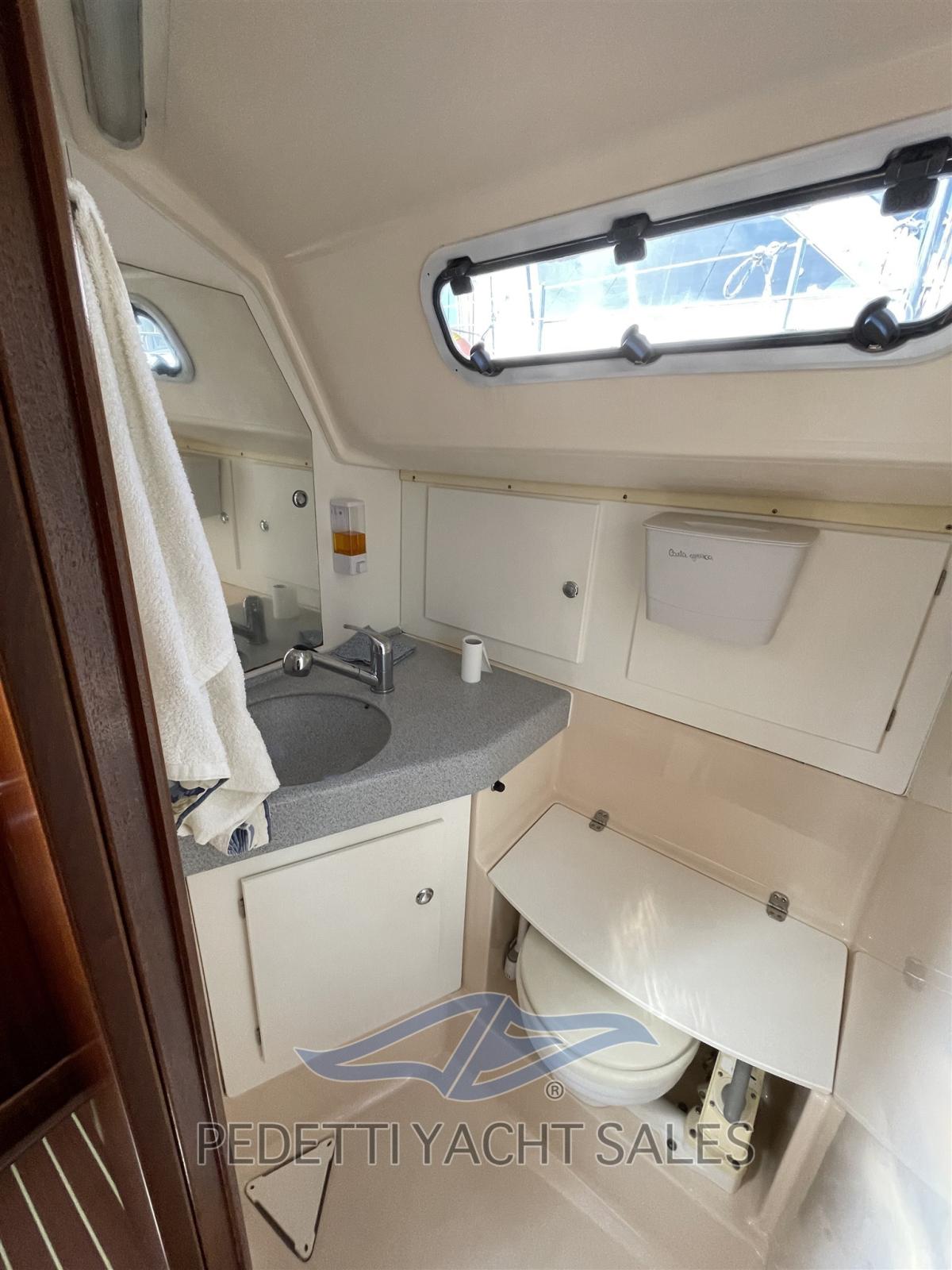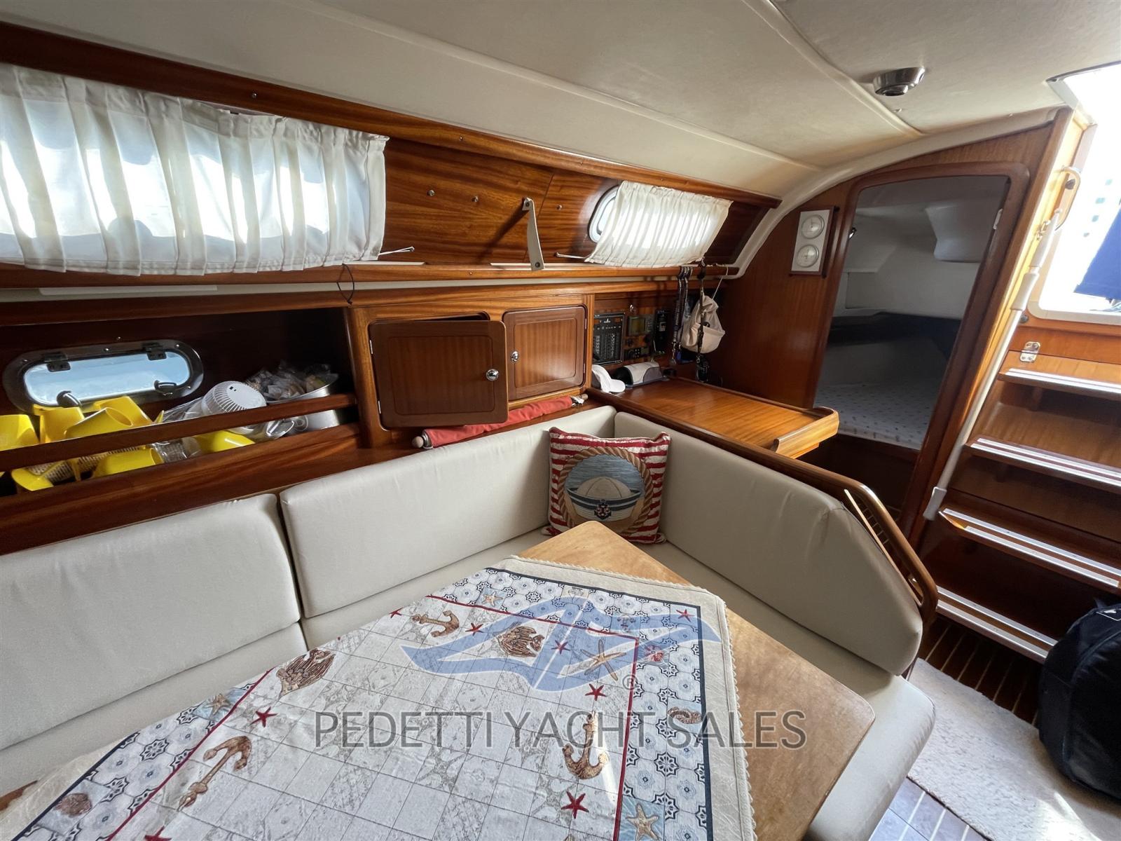 Alternateur, Douche de cockpit, Passerelle, Plateforme arrière, Pompe de cale manuelle, Cockpit en teck, Prise de quai, Guindeau électrique, Gréement monotoron, Echelle de bain, table de cockpit, Table pliante de salon.