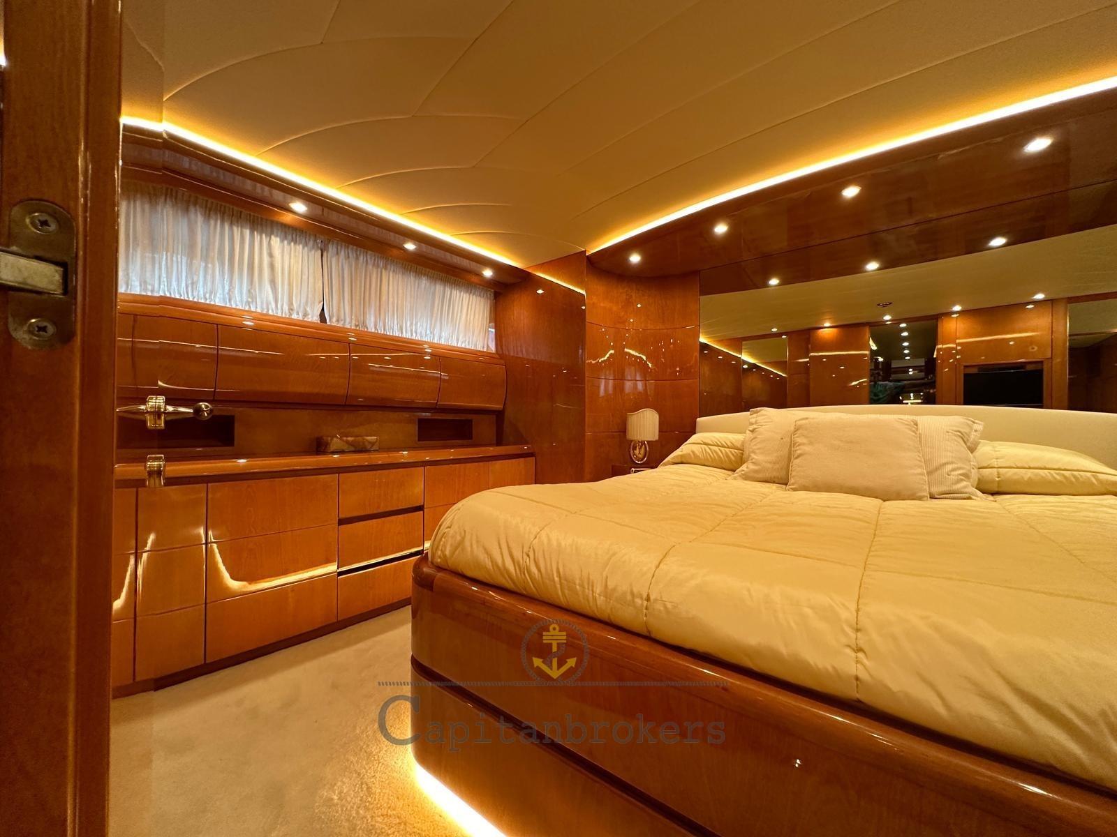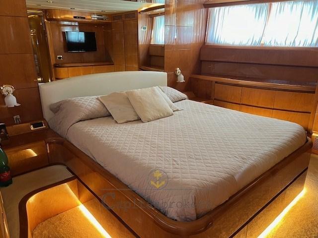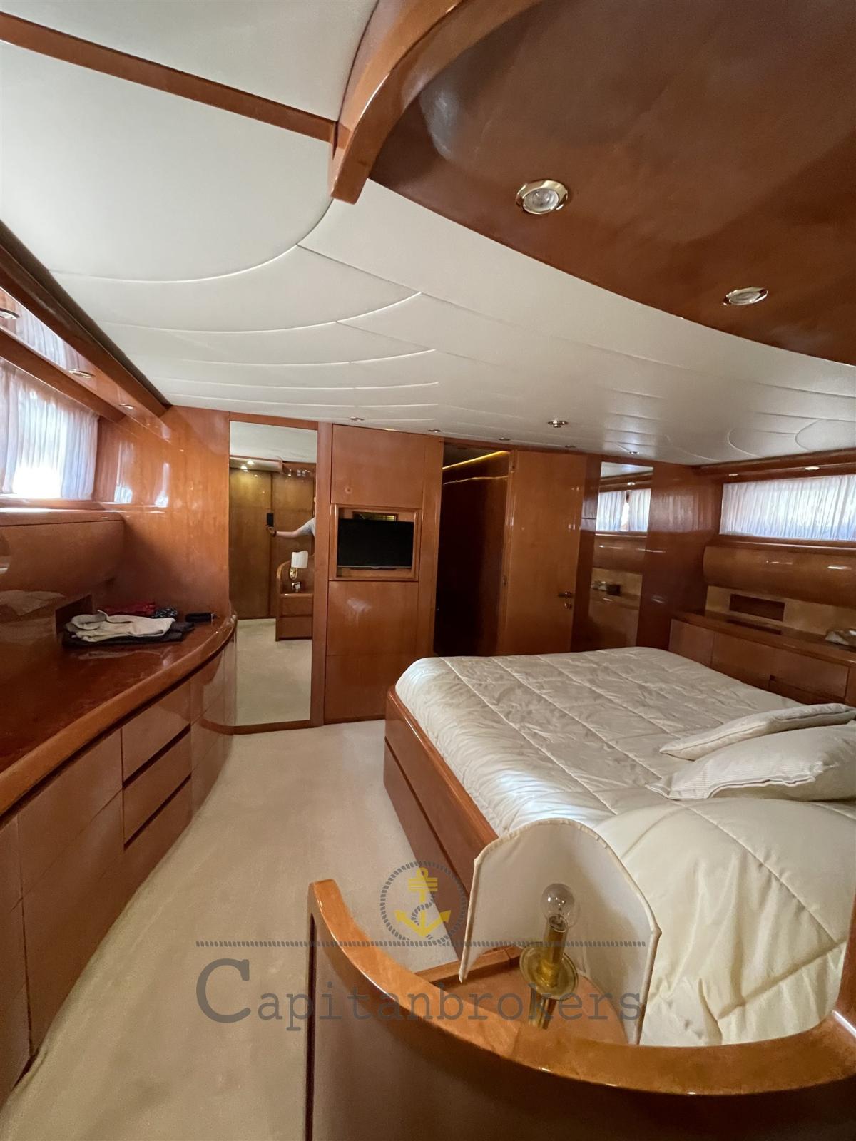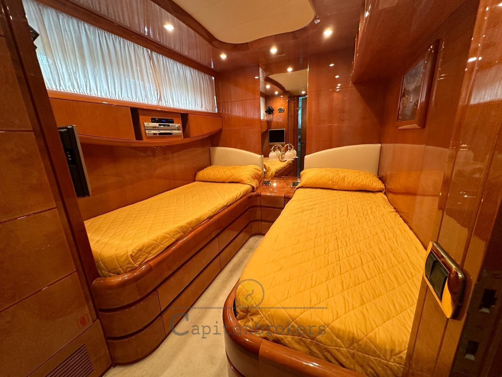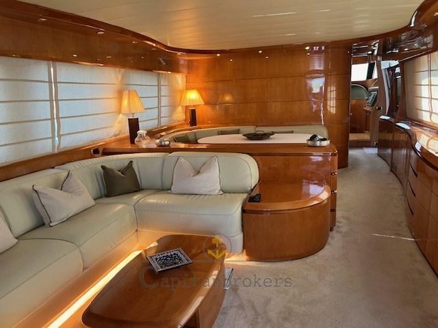 Mobilier intérieur en bois de cerisier laqué brillant en bon état général, parquet avec moquette légère. Salon double avec canapés en cuir, 4 toilettes avec douche et bidet.