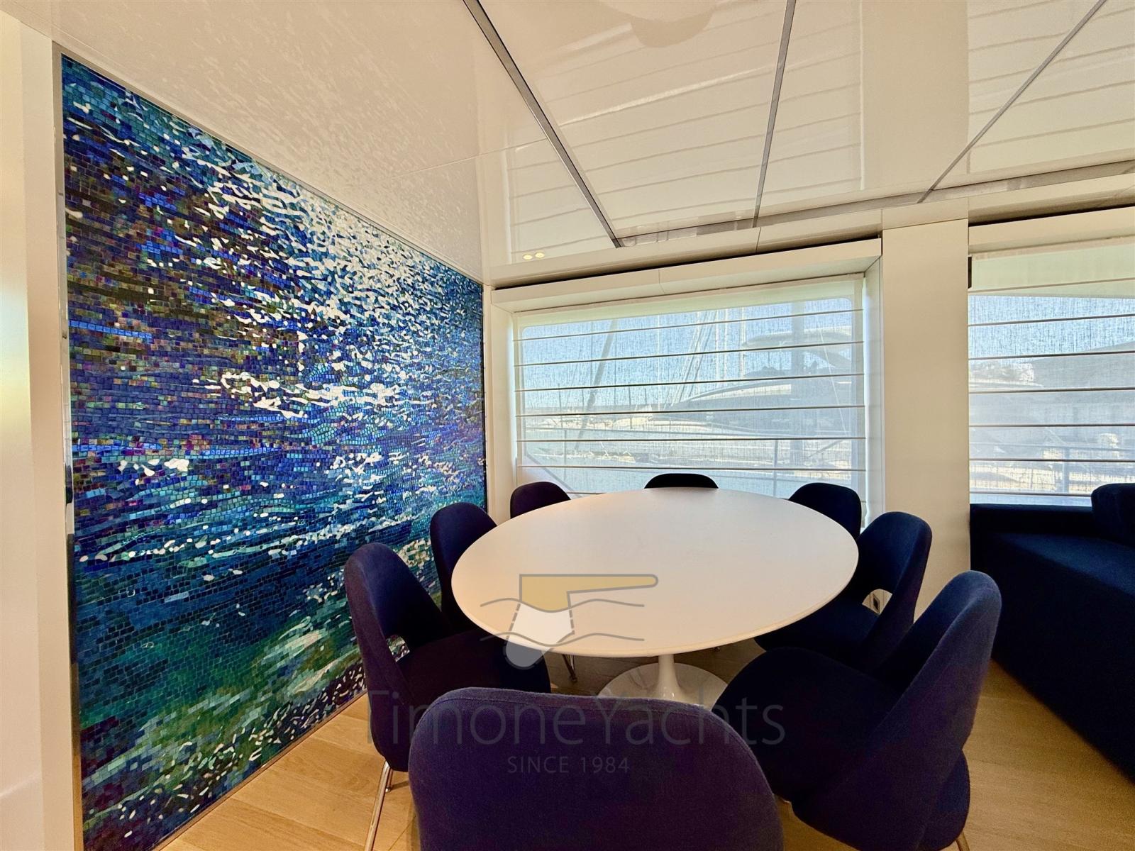 Immense est la plate-forme montante / descendante à l’arrière, tout comme immense est le garage à annexes. Incroyable le flybridge avec ses meubles élégants de style maison.