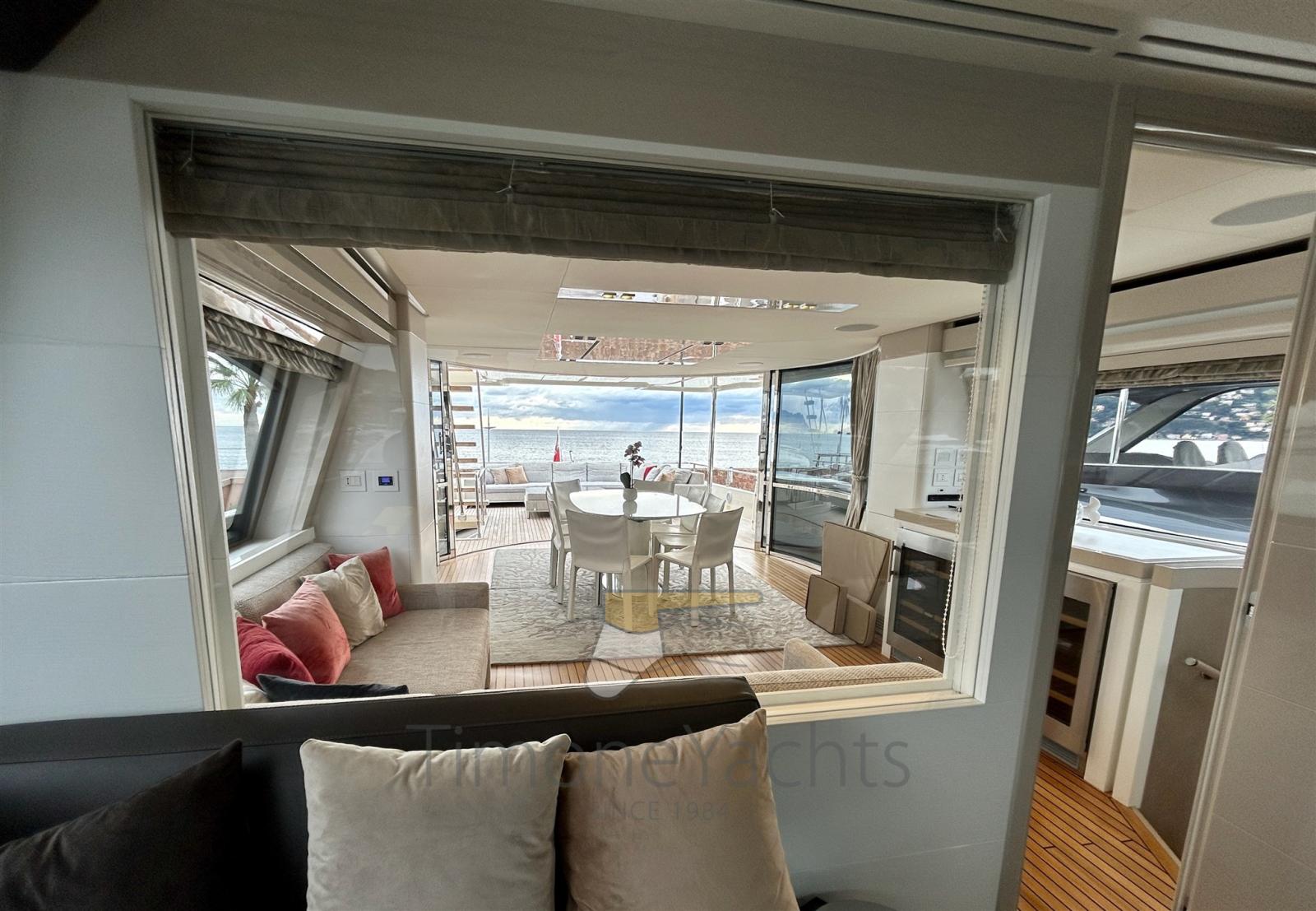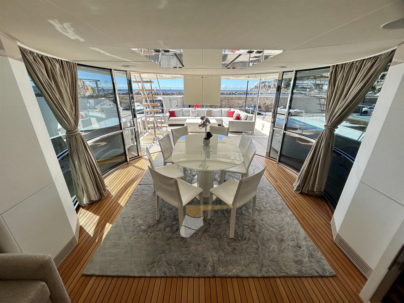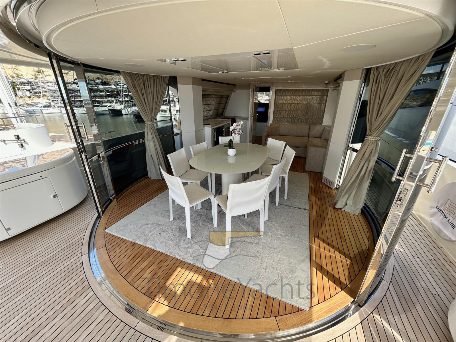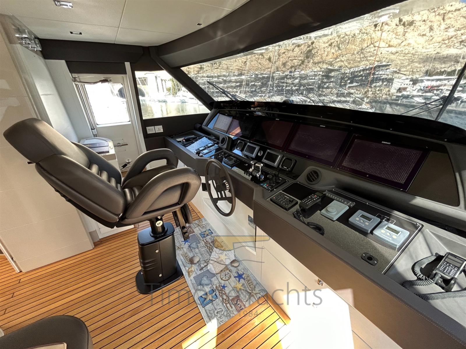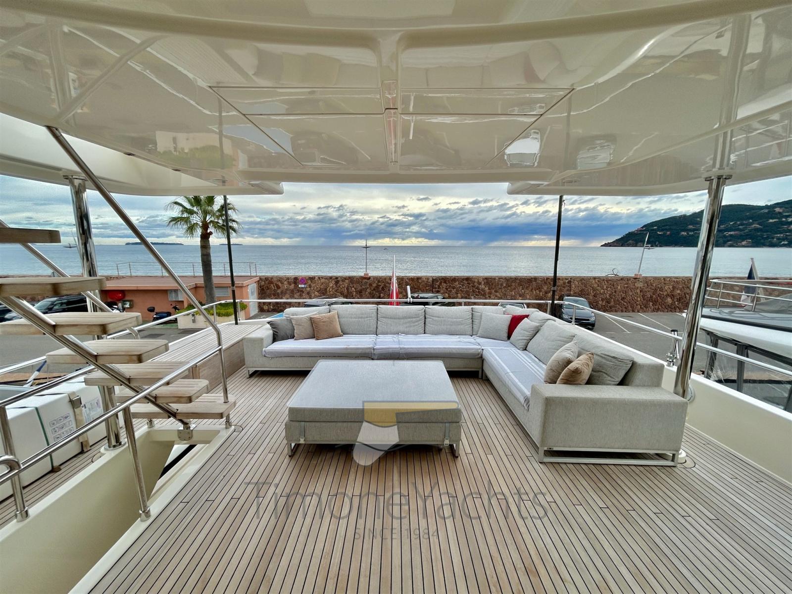 Passavant en teck, Douche de cockpit, Flaps hydrauliques, Garage à annexe, Hard top, Extincteur(s) fixe(s), Indicateurs de flaps, Lavage de chaine, Lavabo dans le cockpit, Éclairage de courtoisie, Spots sous-marins, Passerelle, 3 Porte latérale, Cockpit en teck, Prise de quai, Connexion eau sous pression à quai, 3 Stabilisateurs (ABT TRAC (underway + zero speed) + nr 2 Seakeeper NG9), table de cockpit, Annexe, Corne, 2 Winch électrique arrière, 2 Winch électrique avant.