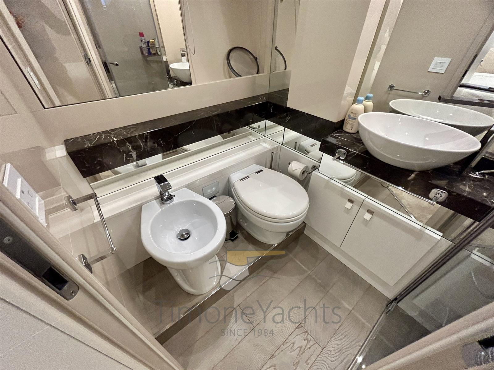 BBQ/ Grill, Ballon d'eau chaude, Coffre-fort, Air Conditionné, Contrôleur domotique, Gradateur de lumière, Dessalinisateur, Cuve à eaux noires, Plancher intérieur en bois, Prises interieures 12v, Prises interieures 220v, Réservoir d'eau noire, 6 Toilettes électriques (+ 2 crew).