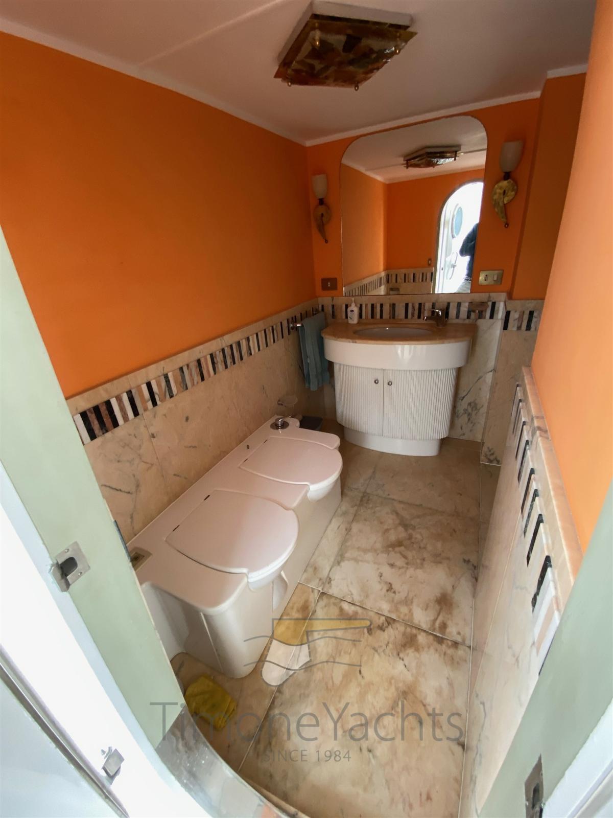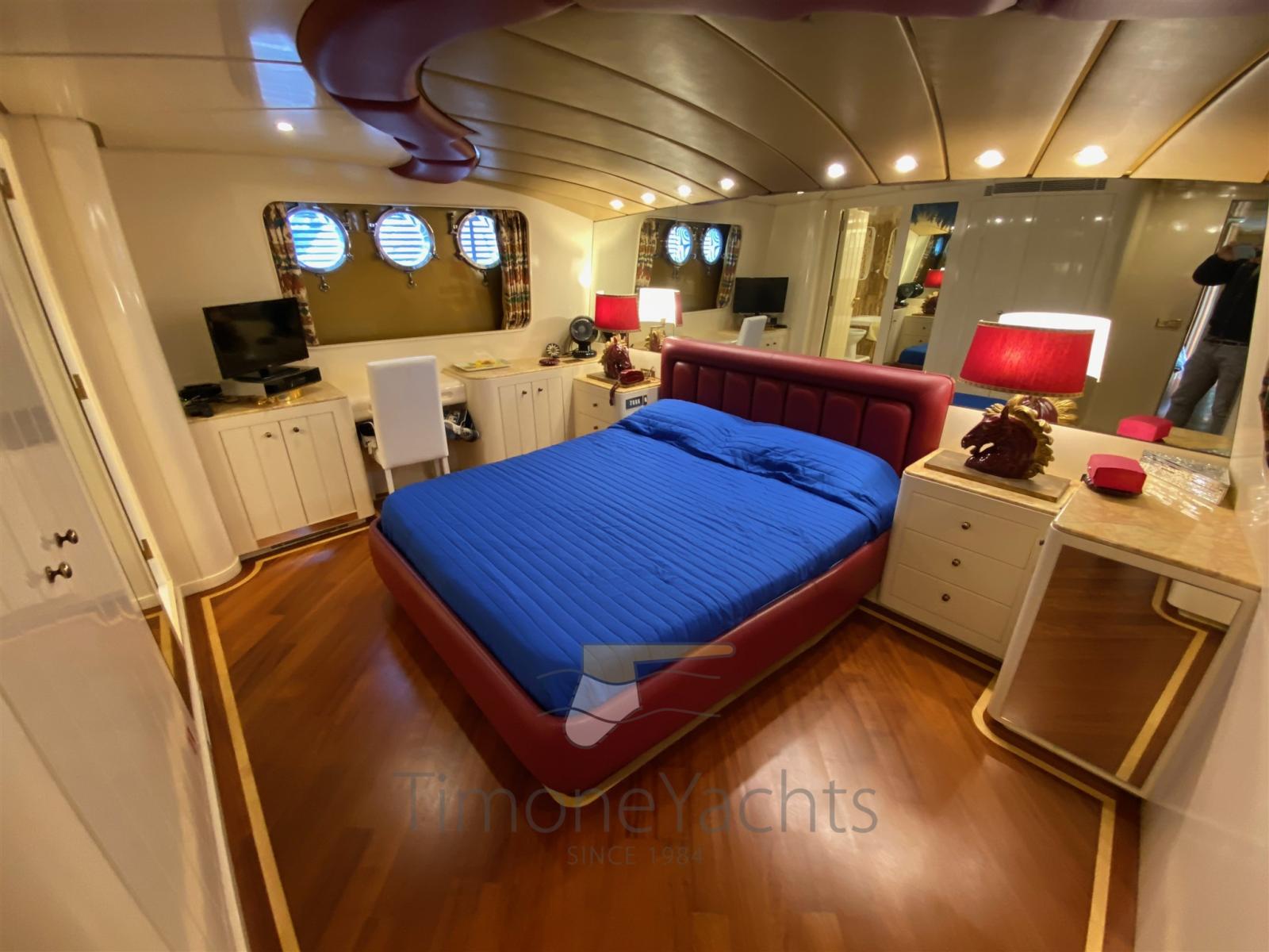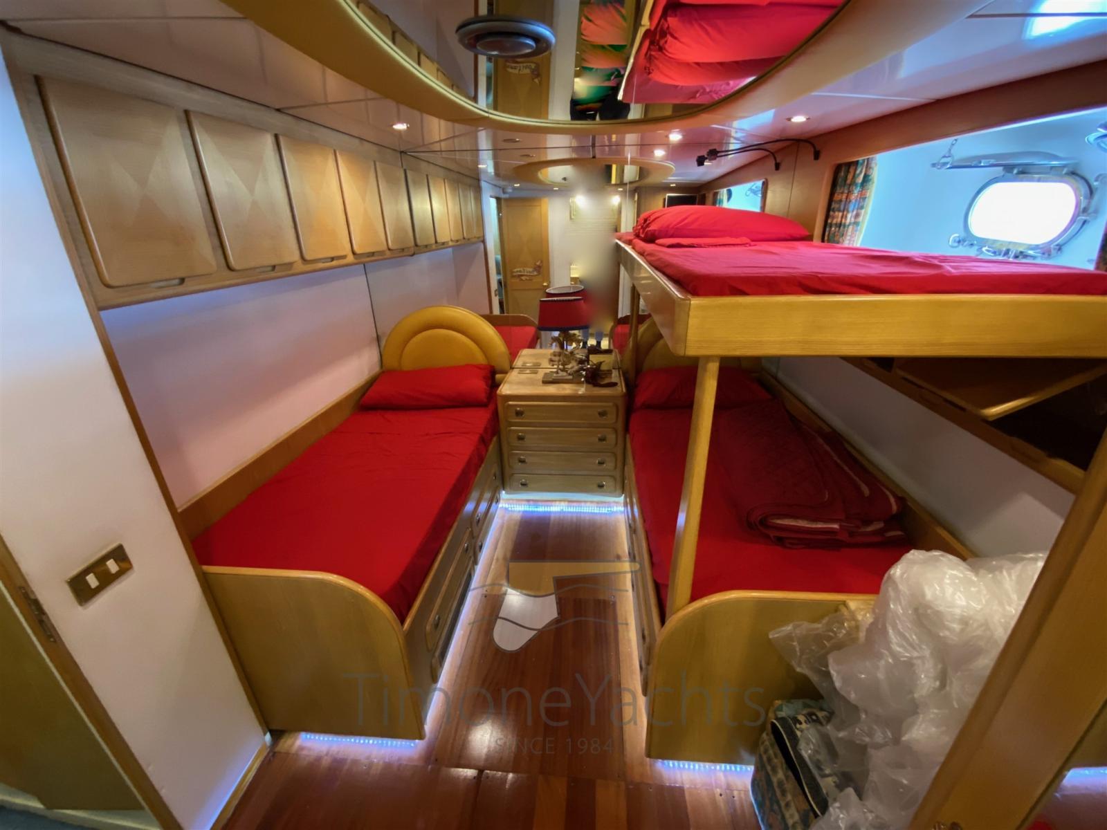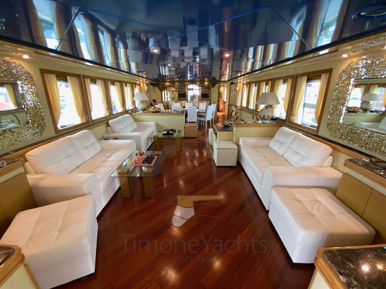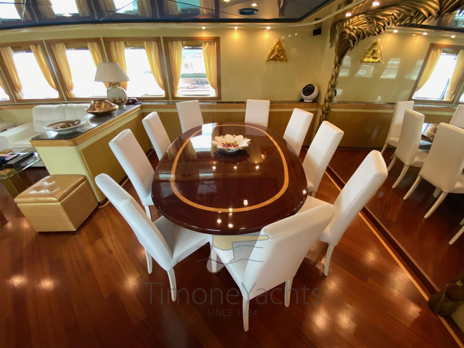 Les volumes sont abondants, tout comme le confort à bord. Il peut accueillir 12 invités dans 5 cabines + 6 membres d’équipage dans 3 cabines. Les caractéristiques intéressantes sont une deuxième cuisine sur le pont principal et une salle de bain de jour avec douche et bidet le long de la passerelle bâbord : si grande qu’on ne pourrait pas l’appeler « diurne ». Le flybridge est infini : une fois les deux grandes annexes dans l’eau, il est facile d’organiser une fête avec plus de 100 invités.