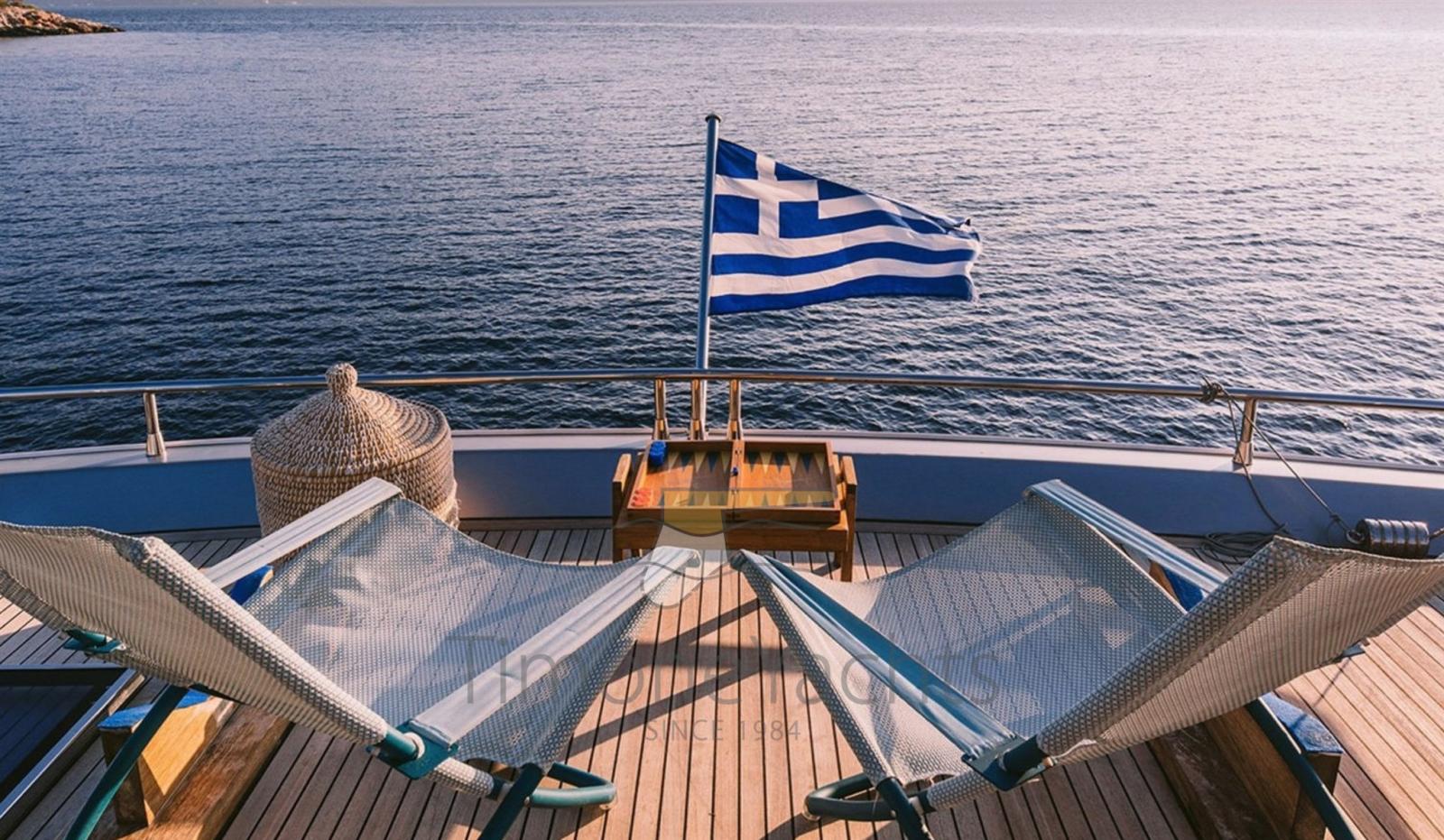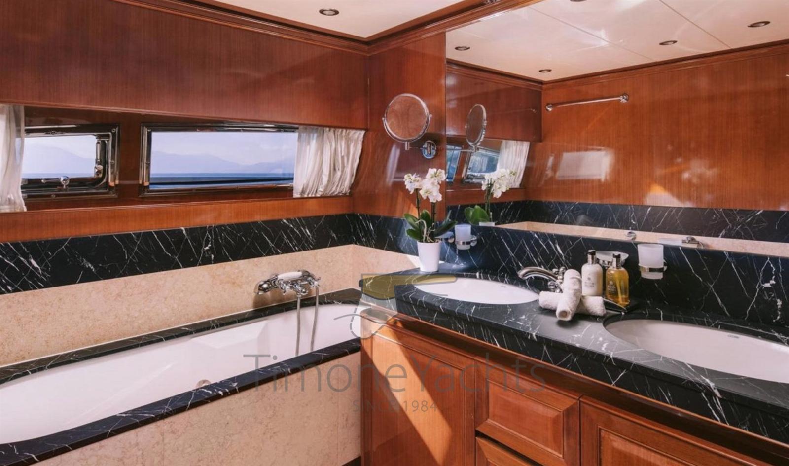 10 Batteries (18 x Varta), Passavant en teck, Douche de cockpit, Phare de poursuite, Bossoirs pour annexe, Grue de flybridge, Extincteur(s) fixe(s), Indicateurs de flaps, Lavage de chaine, Éclairage de courtoisie, Spots sous-marins, Passerelle, Pont en teck, 2 Porte latérale, Cockpit en teck, Echelle de bain, table de cockpit, Annexe (Grant S 4.30m Yamaha 60 hp), Corne, Winch électrique arrière.